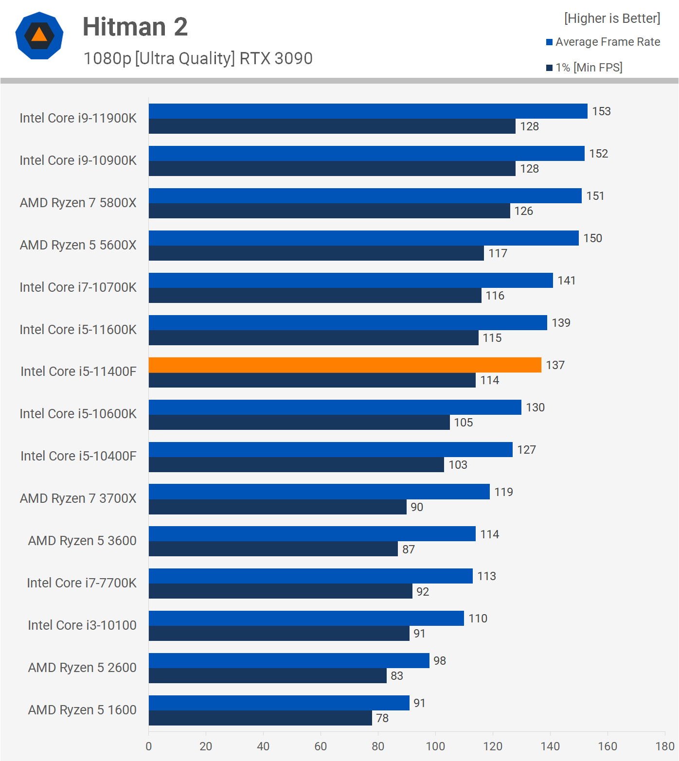 We're back to virtually no performance difference between the 11400F and 11600K with Hitman 2. The 11400F was 8% faster than the 10400F, too, so a reasonable performance uplift.