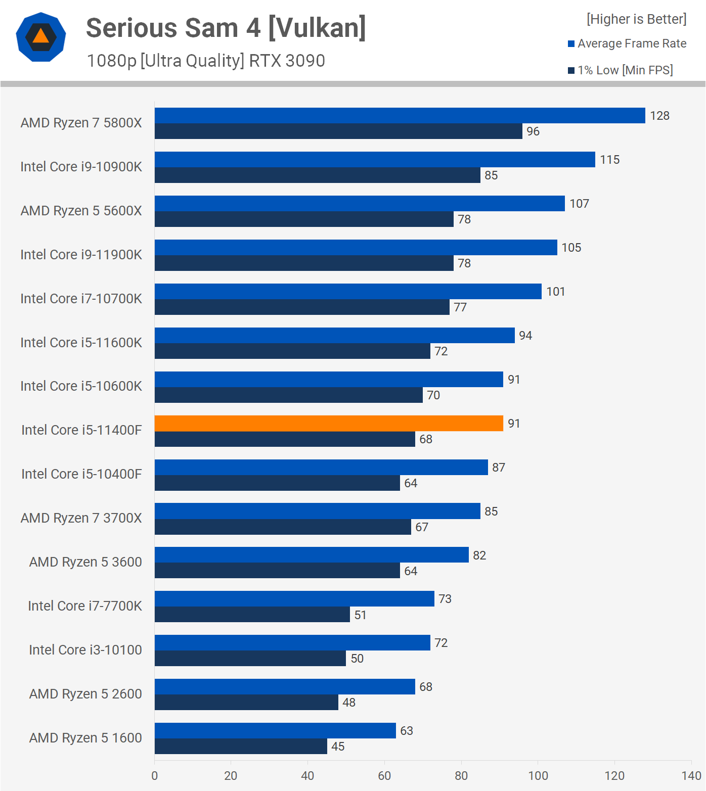 There's very little difference between the two 11th gen Core i5 processors in Serious Sam 4 and the 11400F was just 5% faster than the 10400F. When compared to the AMD processors, it was 11% faster than the R5 3600 but 15% slower than the R5 5600X.