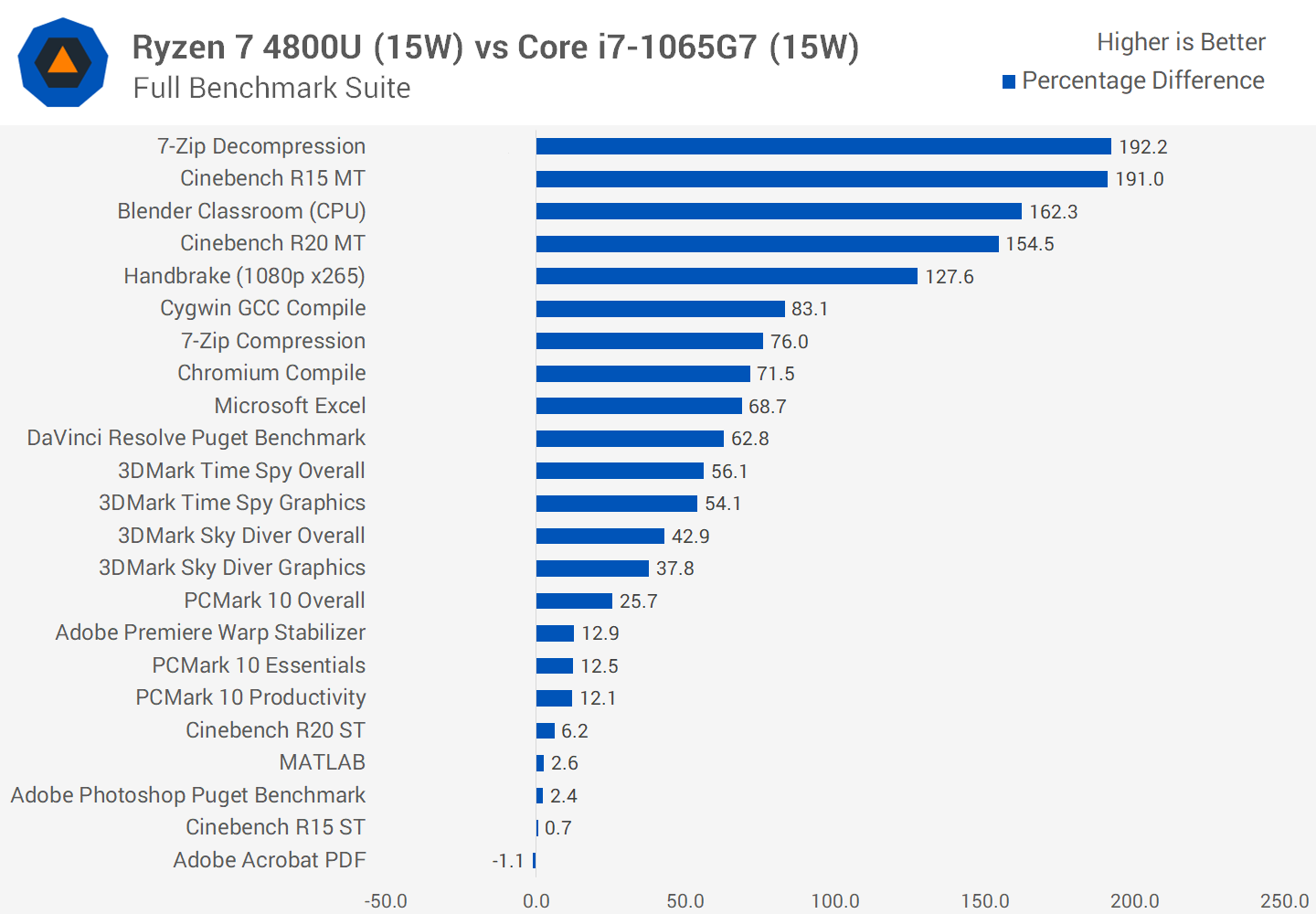 When putting the Ryzen 7 4800U up against the Core i7-1065G7 at the same 15W power level, the Ryzen APU is almost always faster. In multi-thread workloads that margin is significant, it's reasonable to expect more than double the performance. But even in most single-thread tests, the 4800U holds a narrow margin.