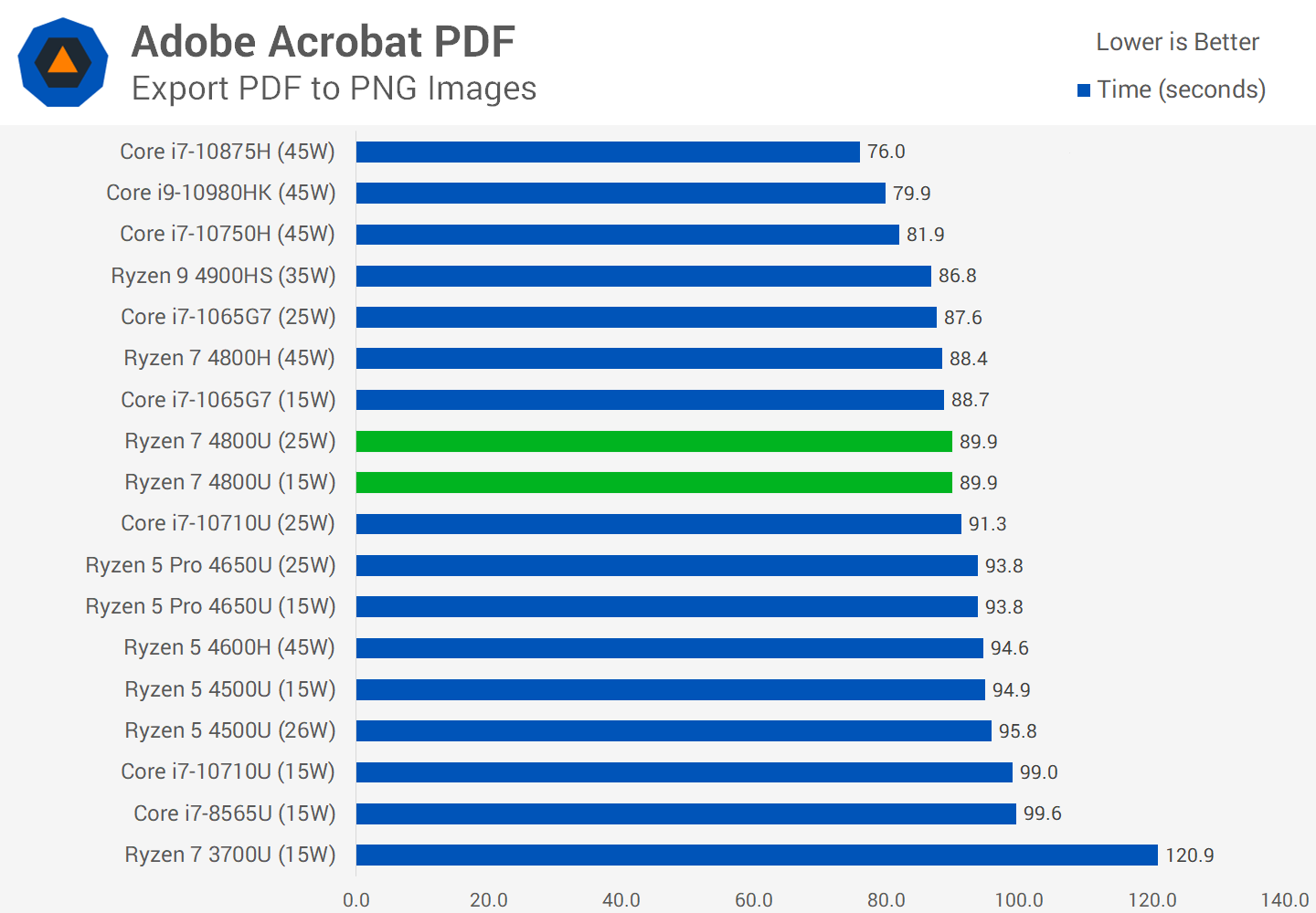In Acrobat PDF exporting, which is entirely single-threaded, the difference between the 4800U and Intel's U-series processors is within the margin of error. In this test which has historically been brutal on AMD APUs, there is no difference in performance.