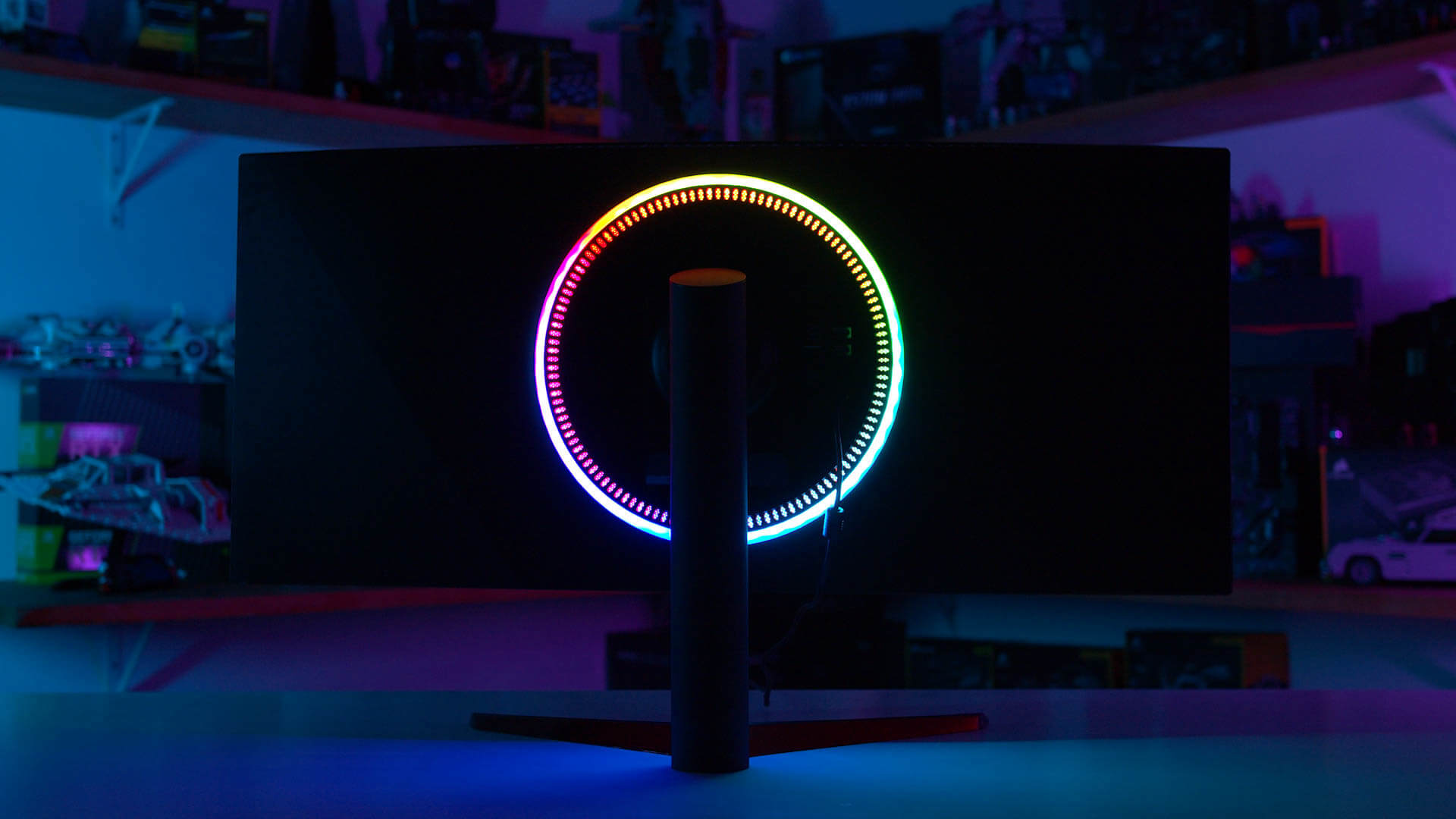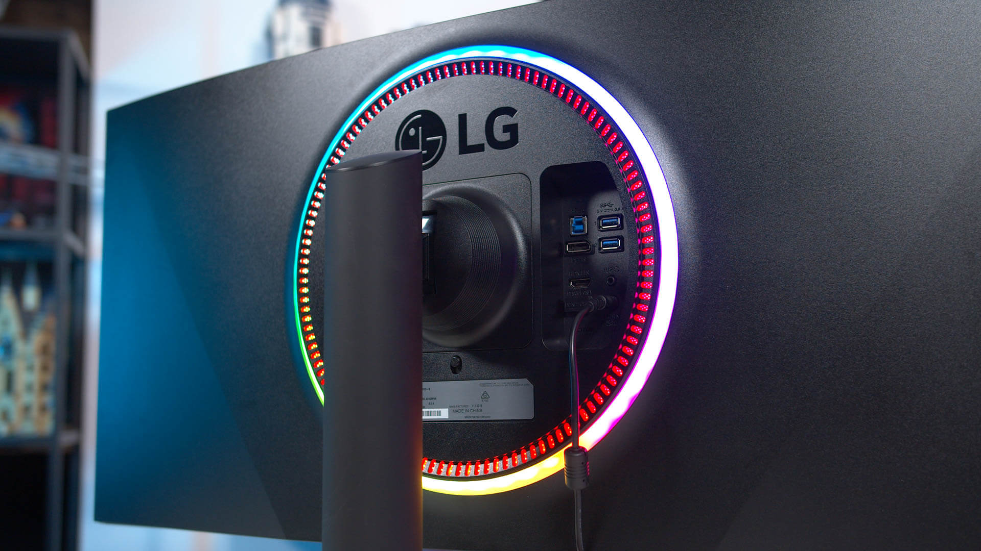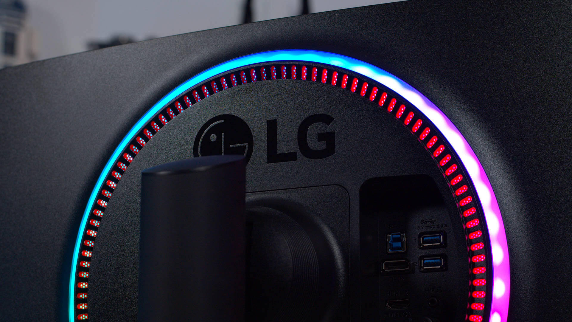 The rear includes a feature LG calls Sphere Lighting 2.0, which is an RGB LED ring around the pillar and ports. We've seen plenty of RGB lighting on a monitor, but we think this is the best implementation. There's many more RGB lights than we usually get, and they're very bright. Often the issue with RGB lighting on the back of monitors is they're dim and can really only be seen from the rear, which typically faces a wall. Well with this, the lighting is bright enough to create an ambient effect around the display.