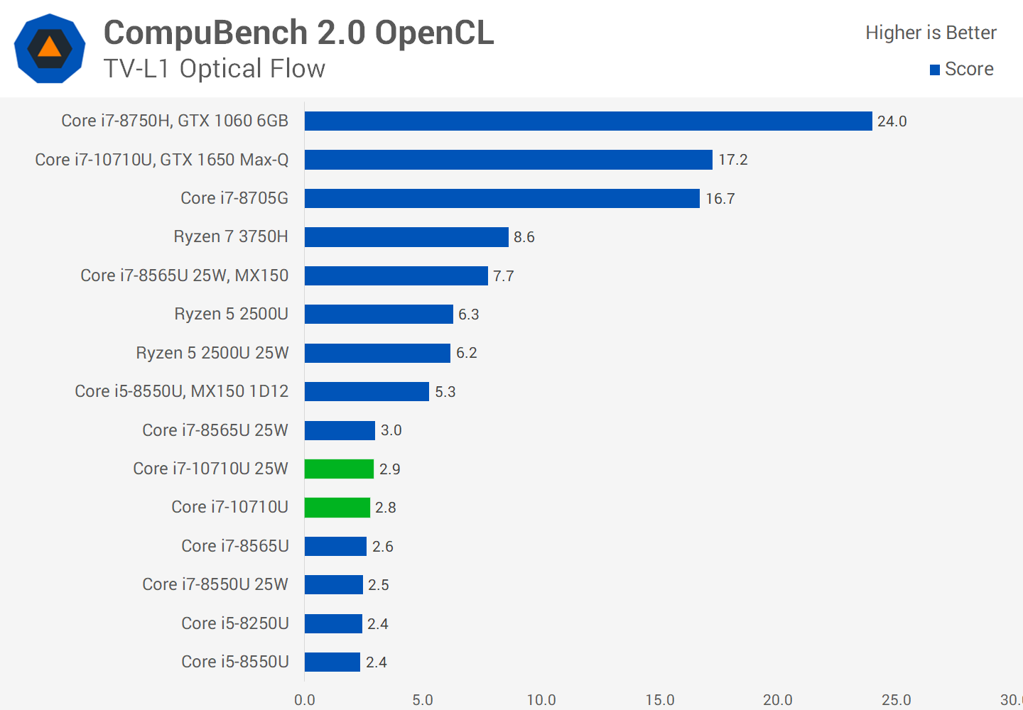 Before we wrap this up, here's another look at GPU performance. Without any improvement to the integrated GPU we aren't seeing an improvement to CompuBench compute performance in optical flow. Adding something like an MX150 is necessary for respectable GPU performance.