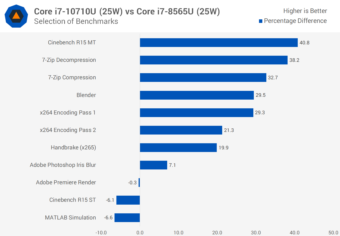 We'll start with a generation on generation look with the Core i7-10710U versus the Core i7-8565U in their 15W configurations. Performance here does vary a bit depending on whether the benchmark is multi-threaded or single-threaded, but in general we're looking at a 25 to 30% improvement in multi-threaded performance going from four to six cores. That's pretty excellent with such a tight power limit.