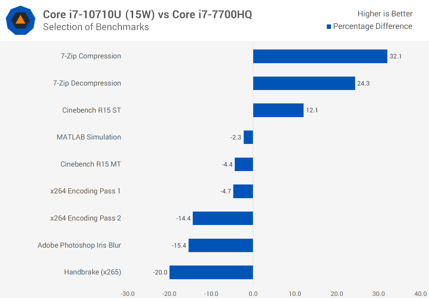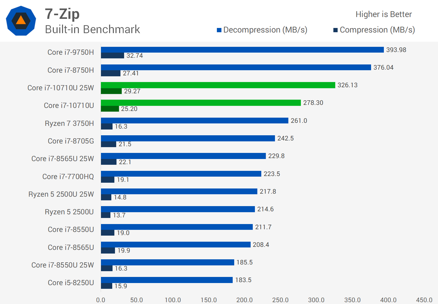 What about something that's not encoding... Once again, six cores is a big improvement in 7-Zip, offering around 30% more performance compared to Whiskey Lake. Given this is a short-run workload that mostly operates in the boost clock region, Intel's steady increasing of boost clocks and turbo power limits has helped here as well, especially compared to CPUs from a few generations ago like the Core i7-7700HQ.
