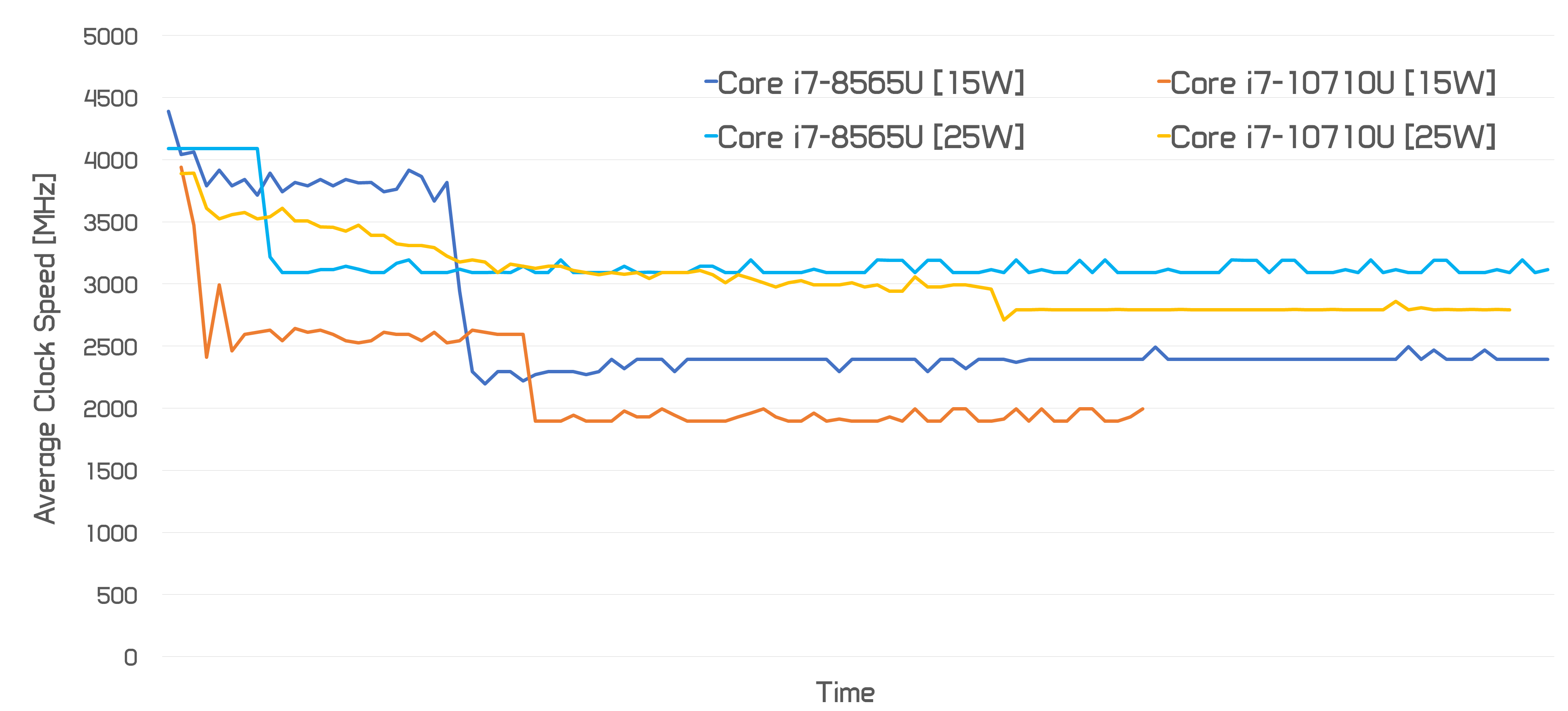 When looking at this clock speed chart for Cinebench, you can see the i7-8565U runs at around 2.4 GHz long term in its 15W configuration, or over 3.0 GHz at 25W, across four cores. The Core i7-10710U runs at just 1.9 GHz at 15W across six cores, so that's 500 MHz lower than the previous-gen quad-cores, or more than a GHz lower comparing 15W to 25W.