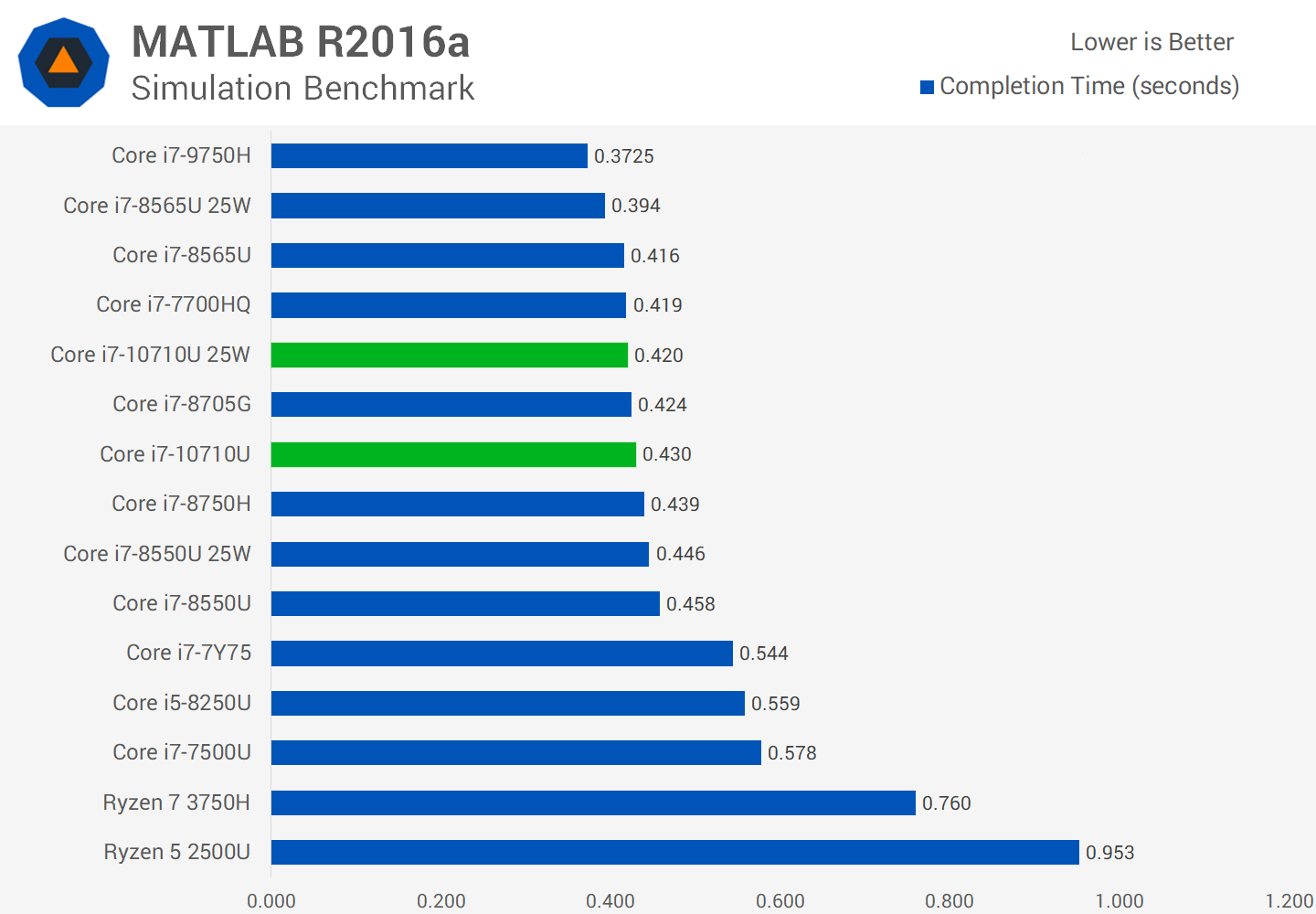 MATLAB is a workload that isn't dependent on anything but memory and cache, so here we don't see much movement or improvement in performance. Comet Lake does support LPDDR4x but our laptop test system is still using DDR4.