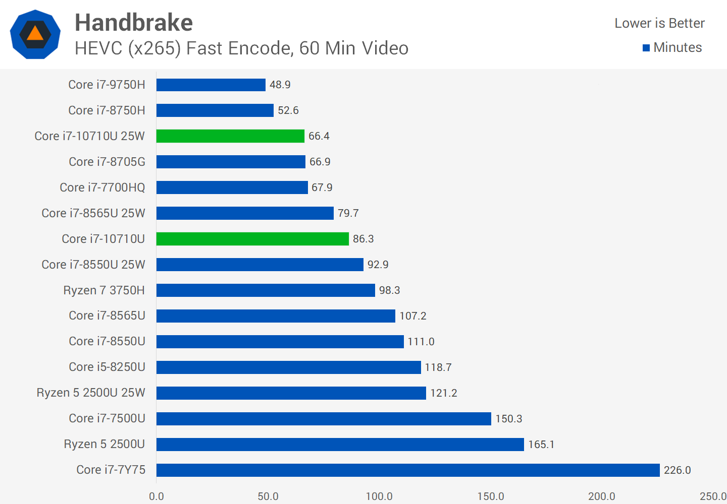 The launch of Comet Lake isn't good news for AMD. The Core i7-10710U is, in our opinion, a much better option than even the Ryzen 7 3750H, and we're talking about a 15W CPU vs 35W here. These CPUs trade blows, despite the 3750H featuring much higher power requirements, and impressively the 10710U even beats it in workloads like Handbrake and especially anything single threaded. The only advantage the 3750H has is a much faster integrated GPU, but that can disappear easily with a discrete GPU pairing, which is becoming more common.