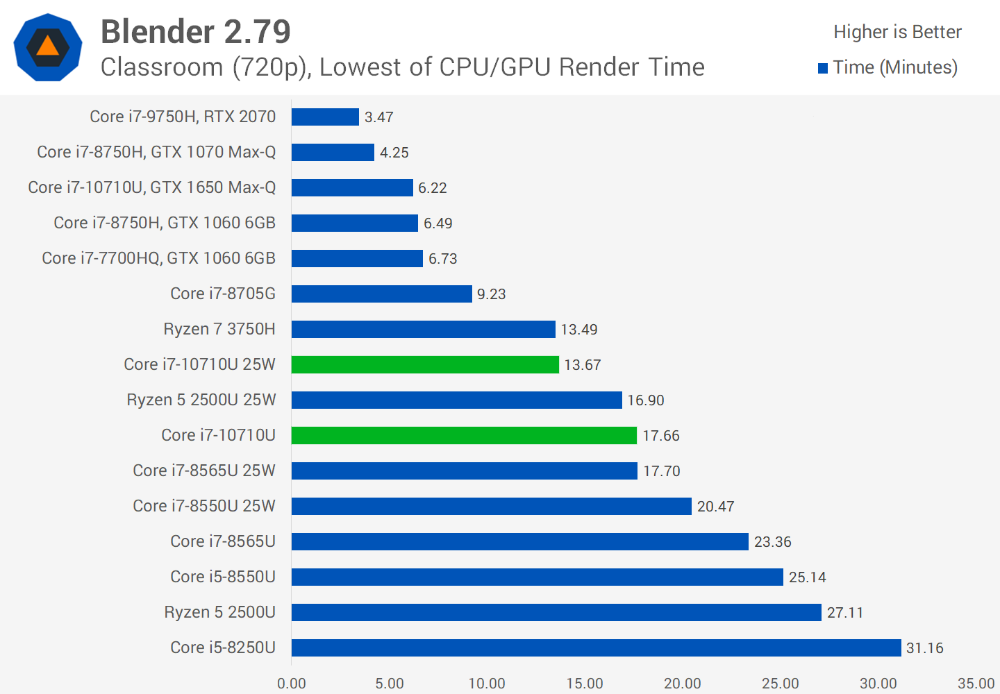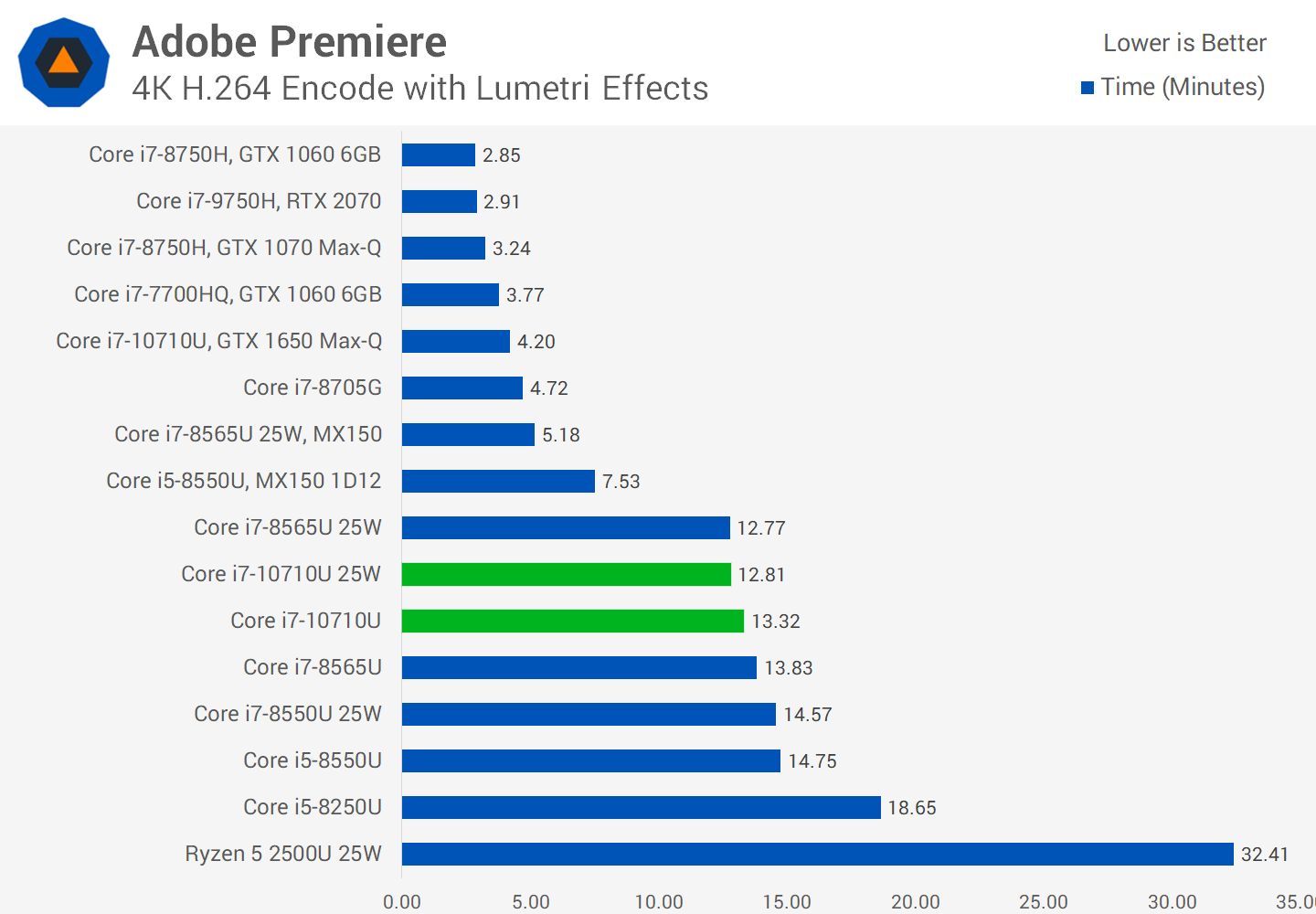 In our non Lumetri benchmark which is a bit lighter on the GPU requirements, we see a modest gain for the i7-10710U over the i7-8565U. You'll still want a discrete GPU here though, and in general for Premiere with any sort of effects applied, your buying decision with this class of laptop could come more down to the GPU you get, rather than the CPU.