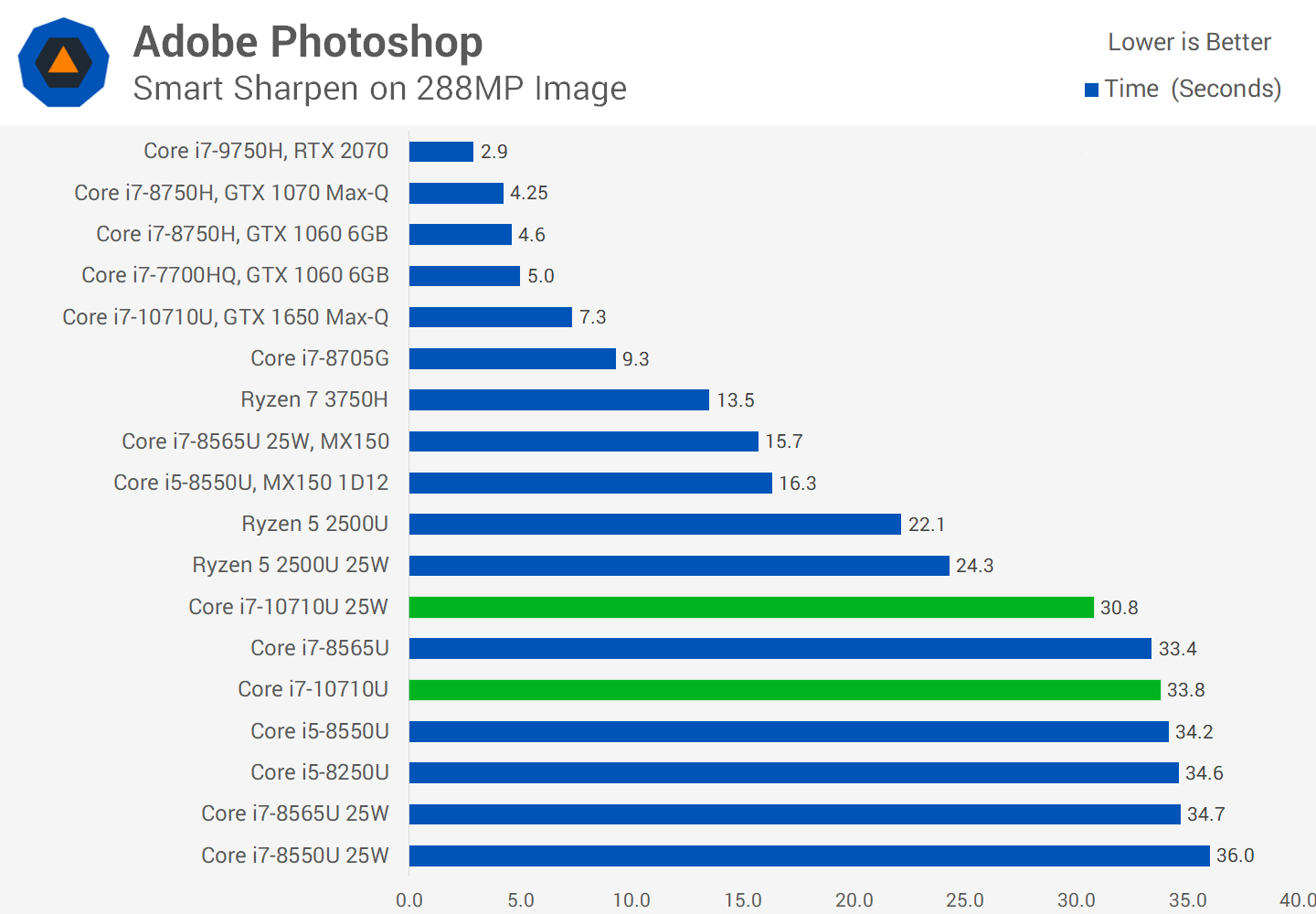 Photoshop's Smart Sharpen filter goes the other way, and becomes GPU limited. Given we aren't getting anything new with the UHD 620 GPU, it's no surprise to see the Core i7-10710U matching other 15W processors.
