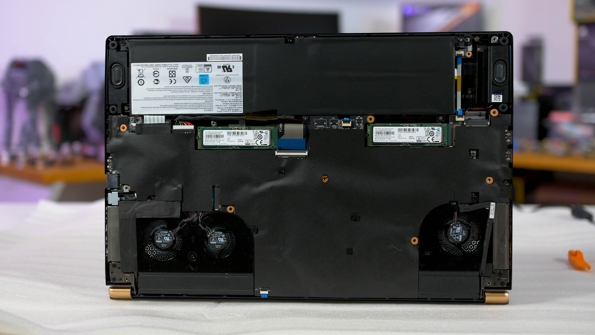 When removing the bottom cover you get easy access to the two loaded SSDs as well as an additional third M.2 slot, which was free in our unit, so there's further room to upgrade the storage in the future. This is also a better internal design than the last-gen GS65 we looked at, which had no access to storage without further deconstruction.