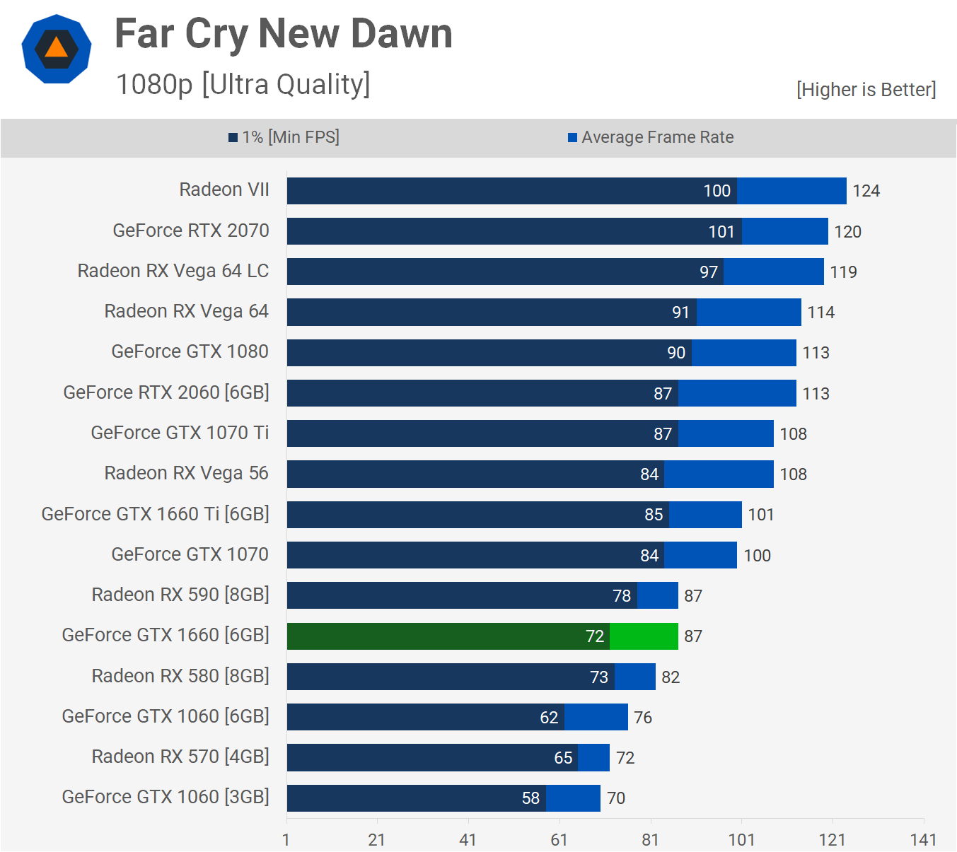 When testing with Far Cry New Dawn the GTX 1660 once again matched the RX 590. With 87 fps on average, performance at 1080p was excellent though admittedly it was just 14% faster than the 1060 6GB. The older Pascal GPU spit out 76 fps on average, so the difference wasn't that noticeable.