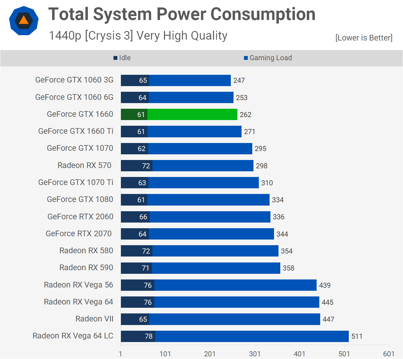 When it comes to power consumption we can observe the new GTX 1660 is extremely fuel efficient, not unlike its Ti sibling. The card pushed total system consumption to the same levels as the already very efficient GTX 1060 6GB, doing so while delivering more performance. In terms of efficiency, there's no question about it, the GTX 1660 is excellent.