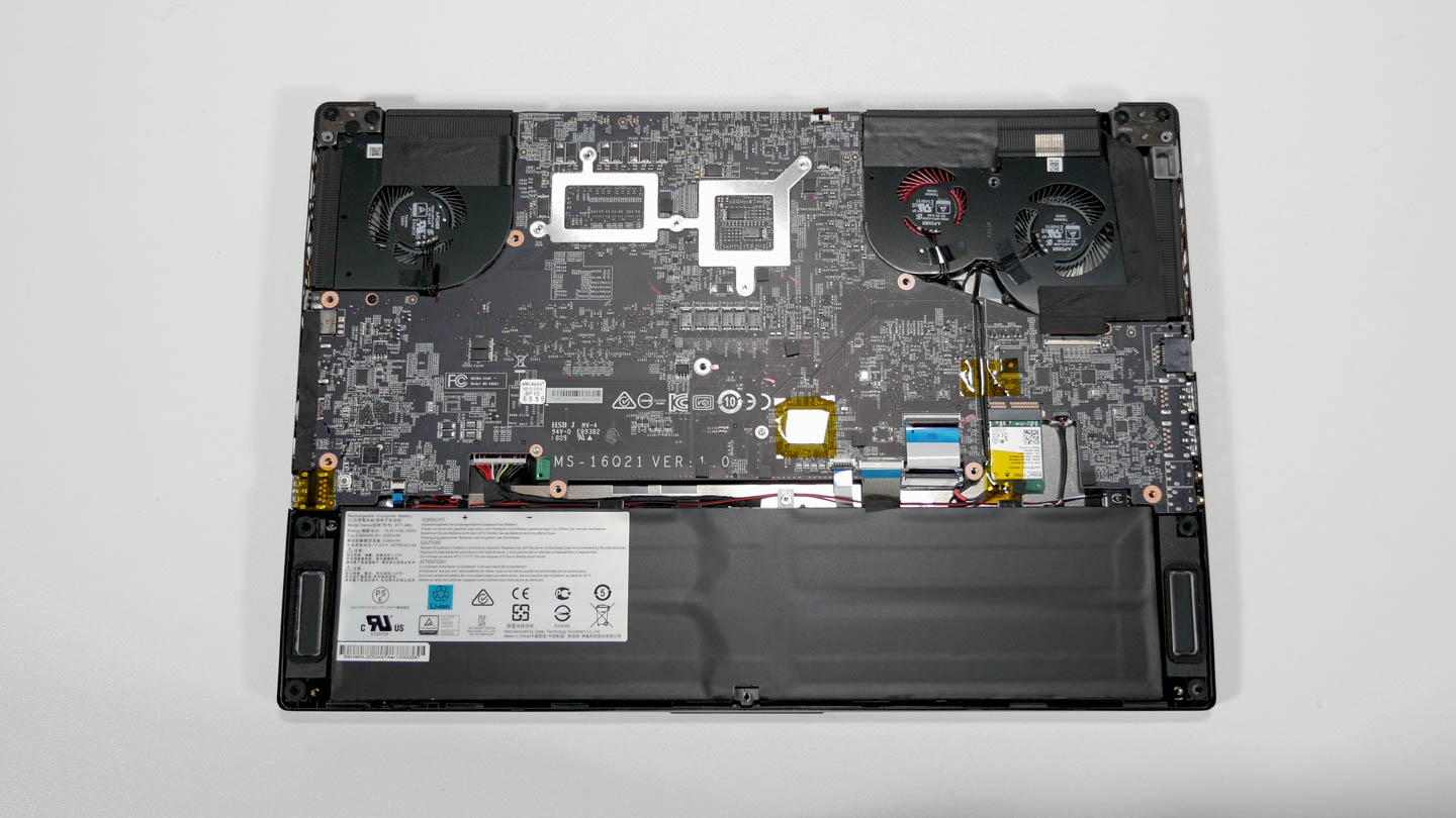 Removing the bottom panel of the GS65 reveals... a flipped motherboard, unfortunately. While you can see the battery and cooling components to a small extent, any access to the RAM and M.2 slots is fairly difficult as you have to remove the entire motherboard and cooling assembly first. There are a lot of small, fragile connectors along the way, so it's not something I'd advise for the casual user. However if you do go down that path, you will find a spare M.2 slot and a spare DIMM slot.
