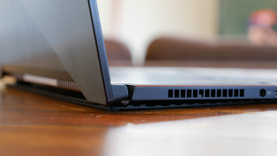 The cooling solution has another unique component, and that's the base that splits apart when the lid is open to ensure maximum airflow when sitting on a desk. It's a great idea from a functional standpoint, as it allows the laptop to remain slim and prevents the fan intakes from being obstructed. From a visual standpoint though, the way the base splits apart and the flimsy plastic construction to the extended section makes the Zephyrus look broken, even though it's not.