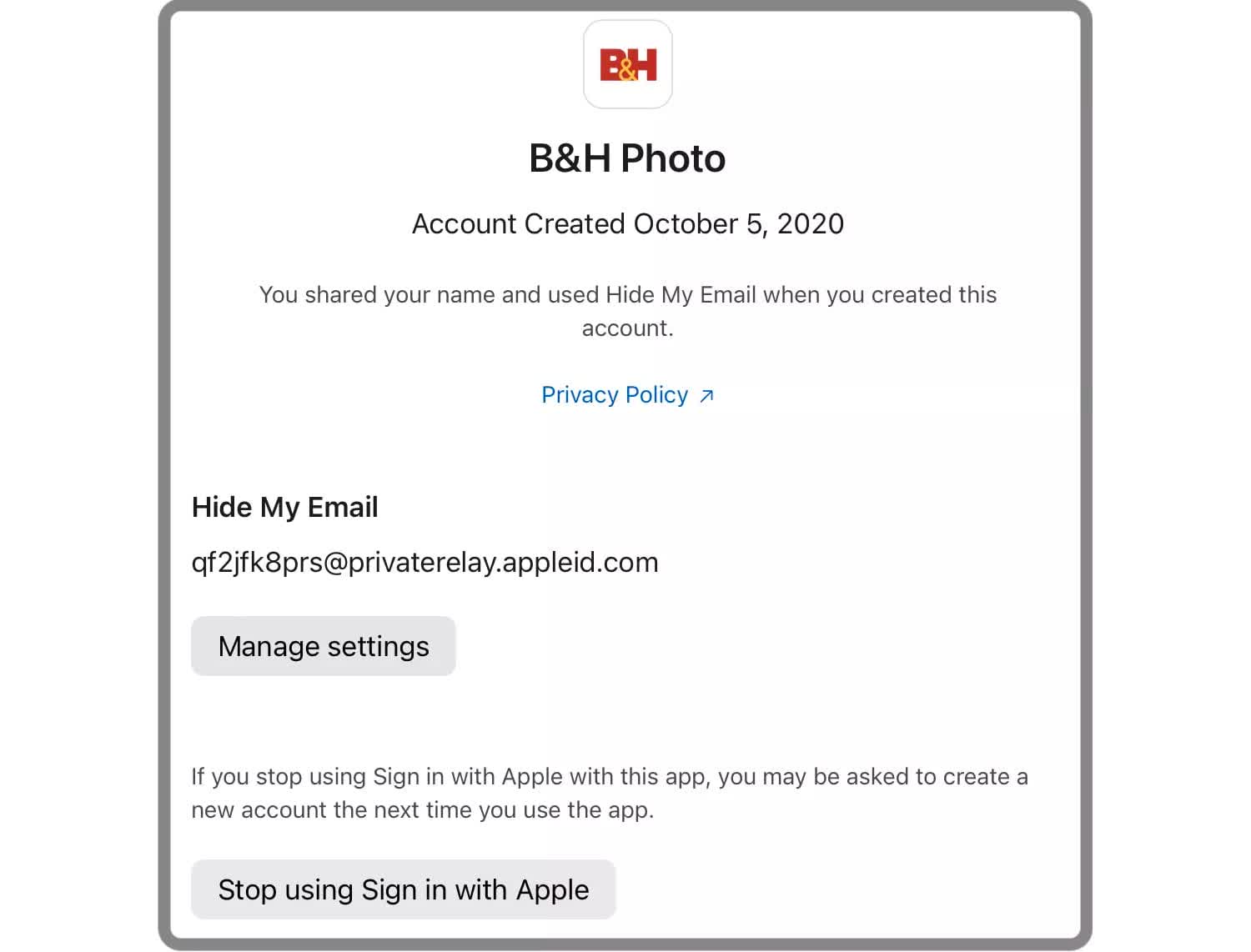 As mentioned before, Apple's one-click authentication can hide your real name and email using an alias that forwards to your regular account. You will see those listed here. When you revoke permission, using the button again will generate a different alias email. So it's not necessary to remember this information.