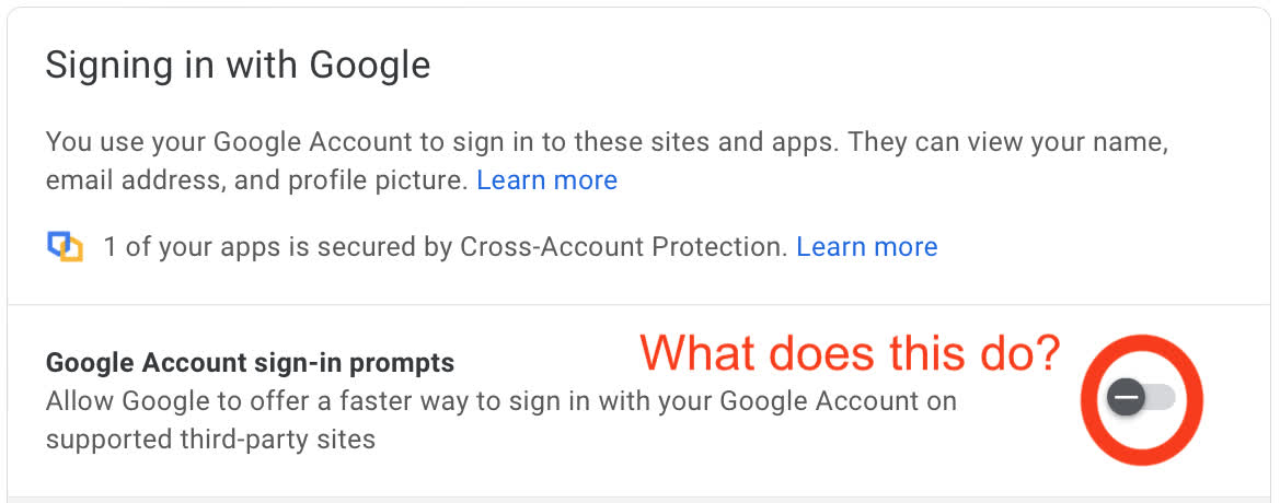 Interestingly, a switch right above the list says it enables/disables the Sign in with Google prompts. However, it appears to do nothing. We tested it and have found that the prompts still work. If you have a better insight into this switch, let us know what it does in the comments.