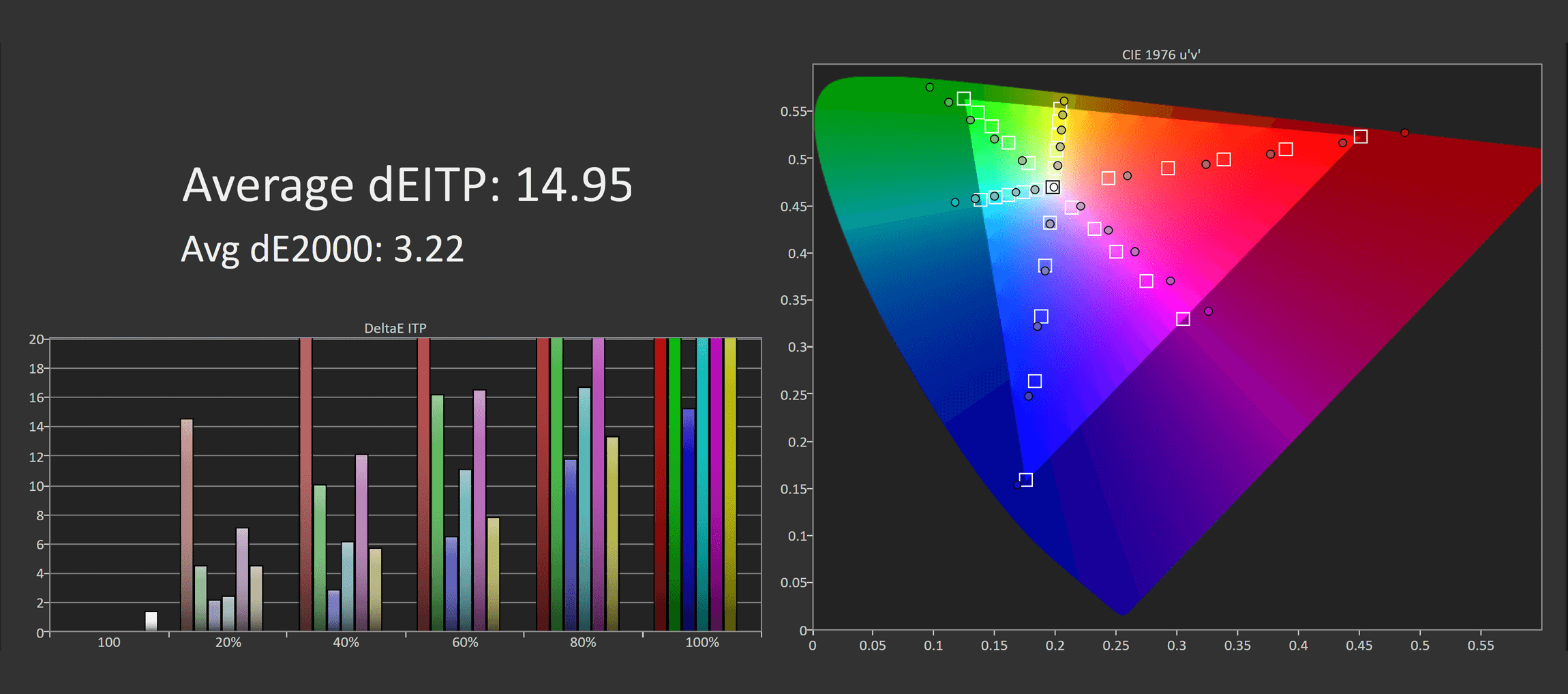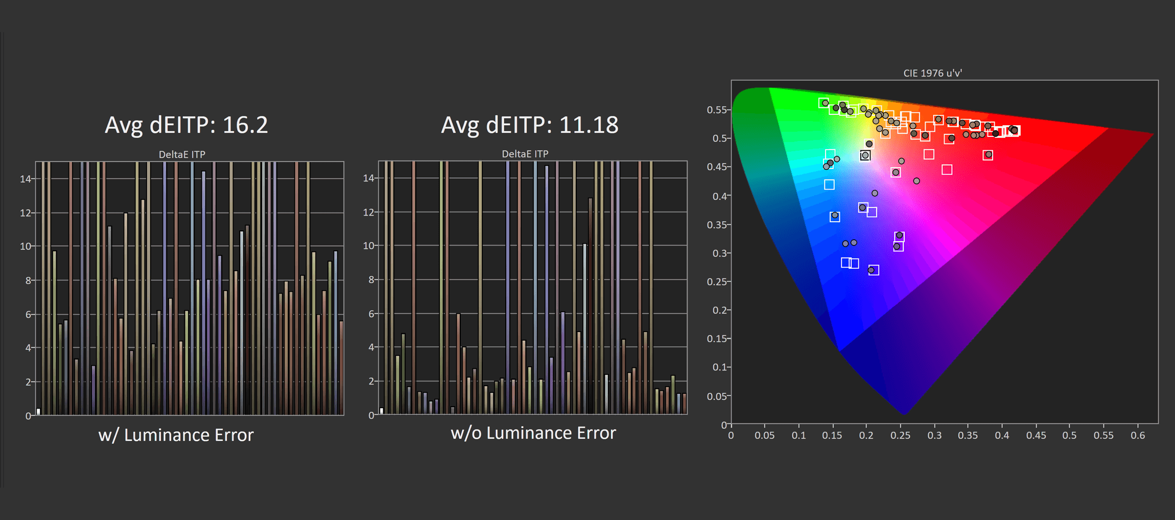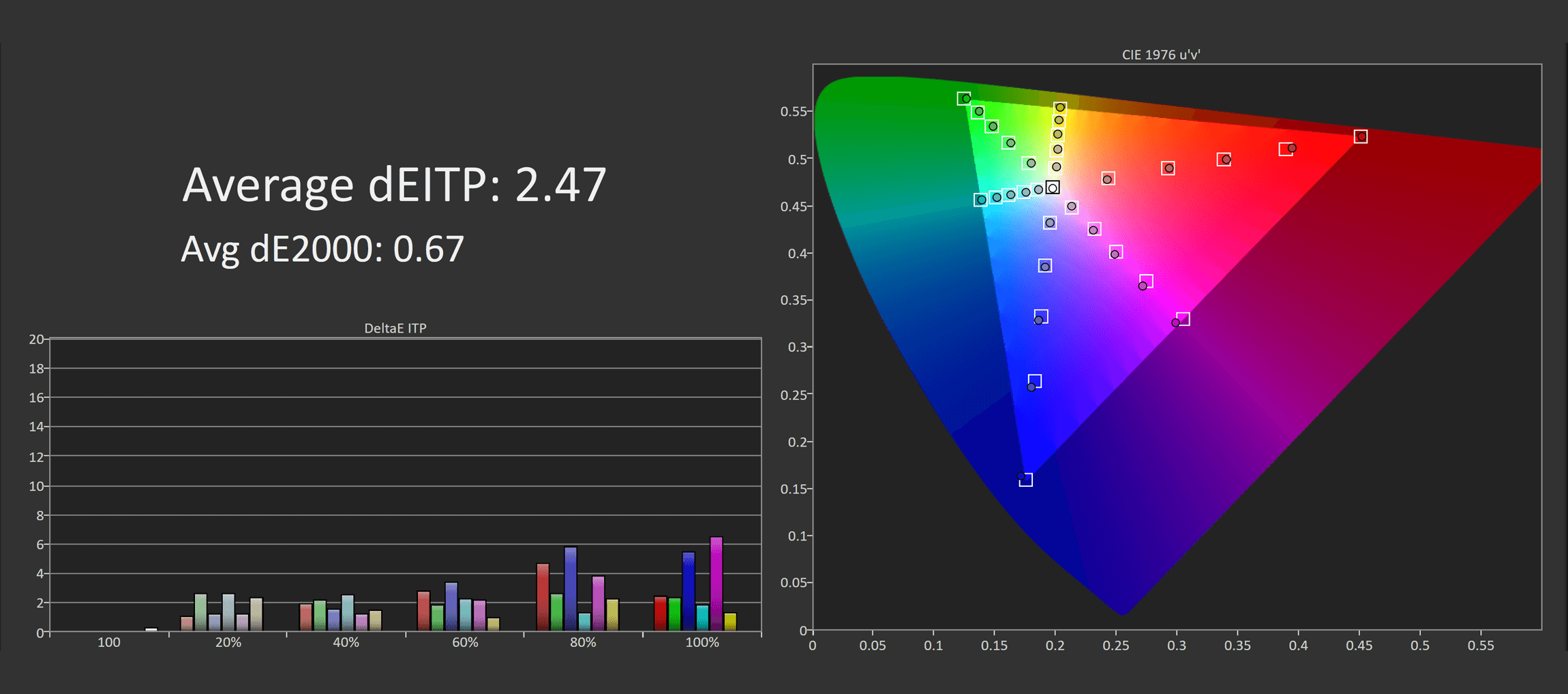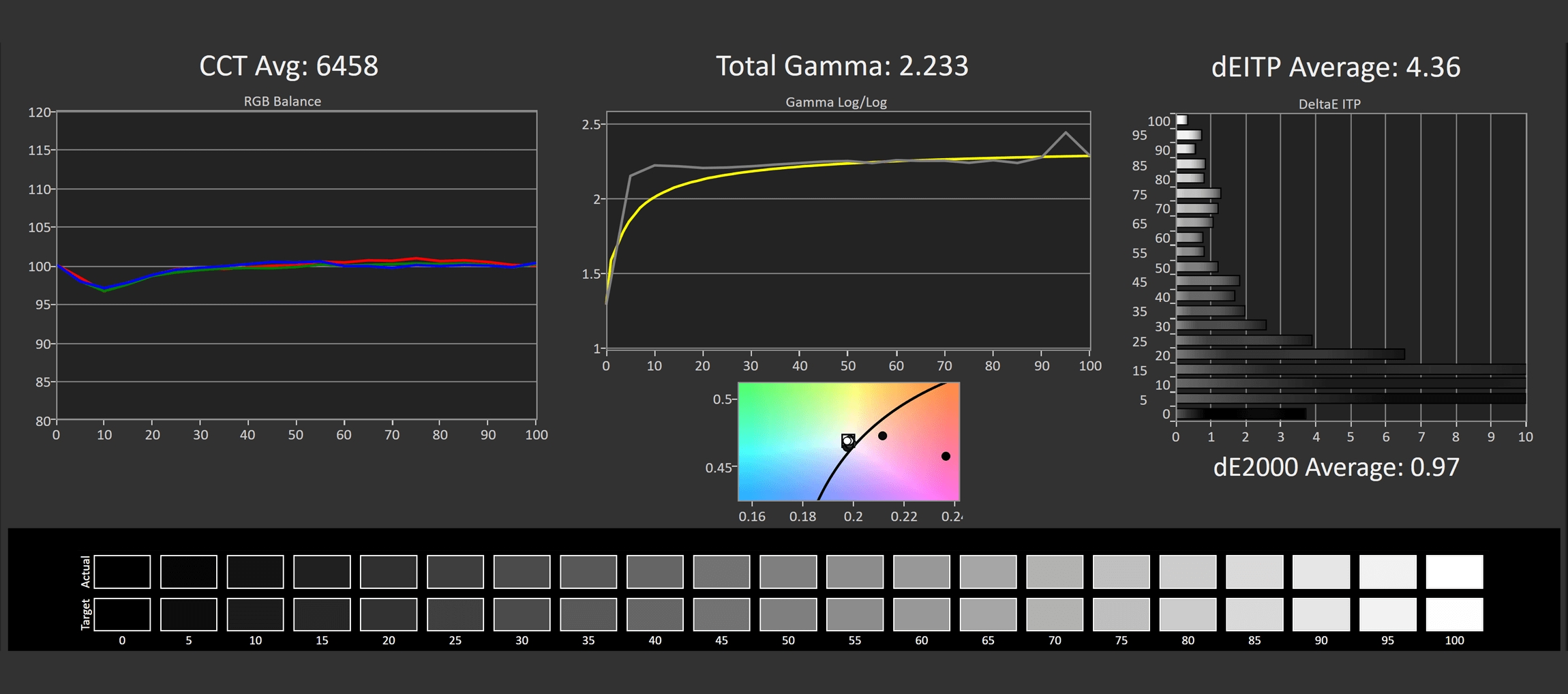 This puts the UCDP in a strong position competitively, though again, calibration is slightly behind the UCDM and the other QD-OLED competition. However, the results in greyscale are much better than the LG model, and the same can be said in ColorChecker. Asus has done a pretty good job of trying to calibrate this 4K OLED as well as their other offerings, so there's little difference between the two in this area.
