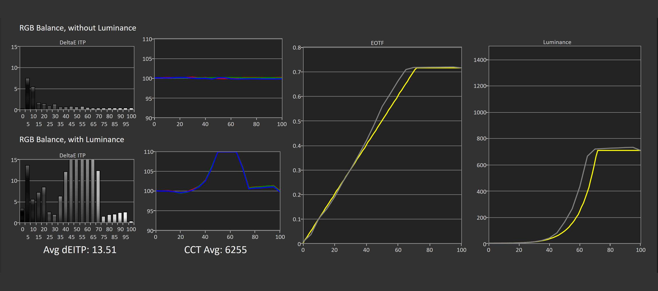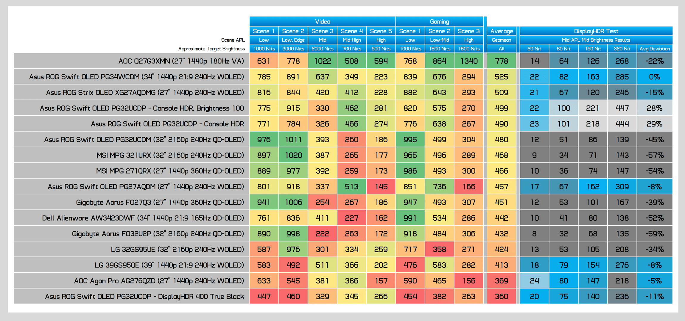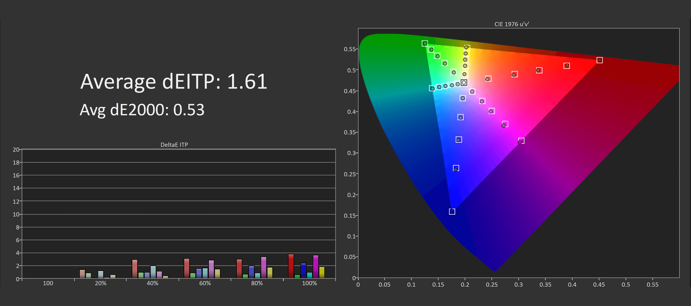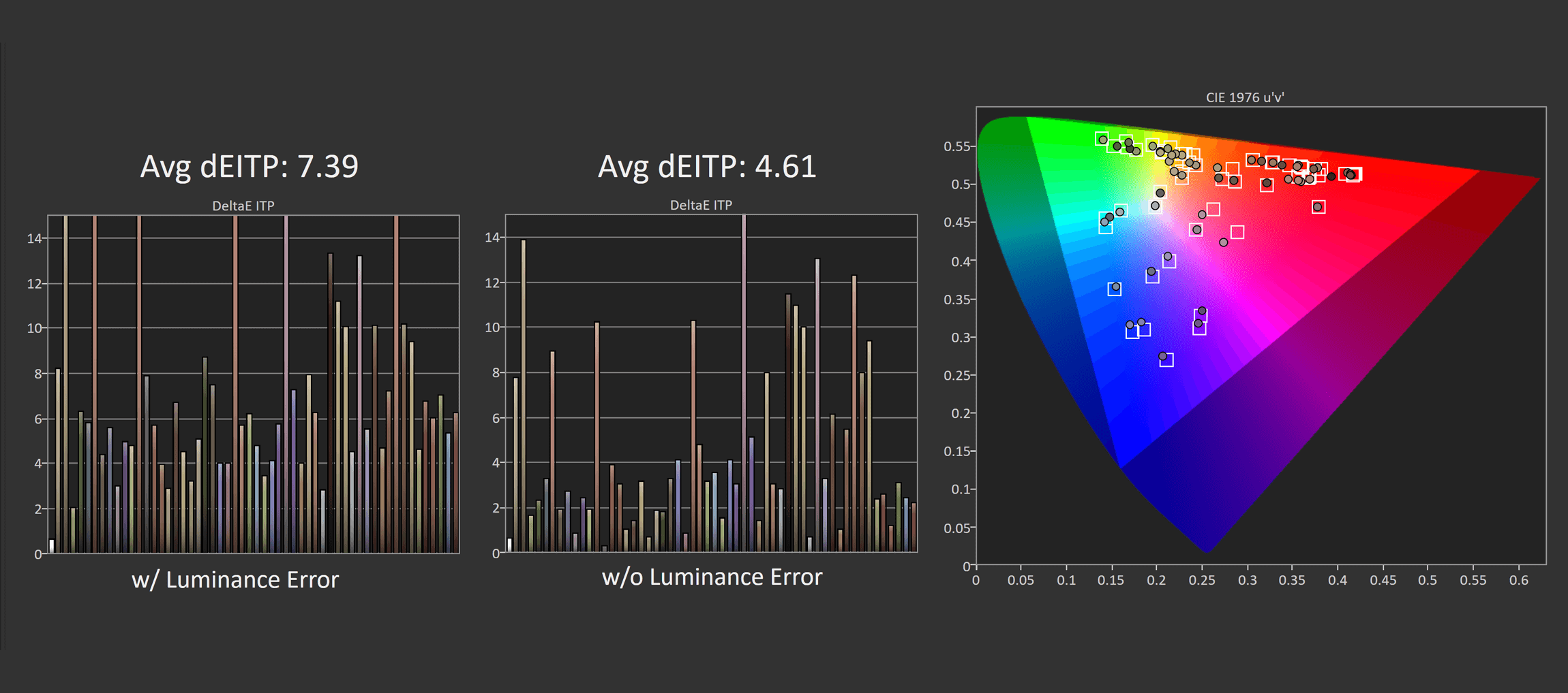 This puts the UCDP in a strong position competitively, though again, calibration is slightly behind the UCDM and the other QD-OLED competition. However, the results in greyscale are much better than the LG model, and the same can be said in ColorChecker. Asus has done a pretty good job of trying to calibrate this 4K OLED as well as their other offerings, so there's little difference between the two in this area.