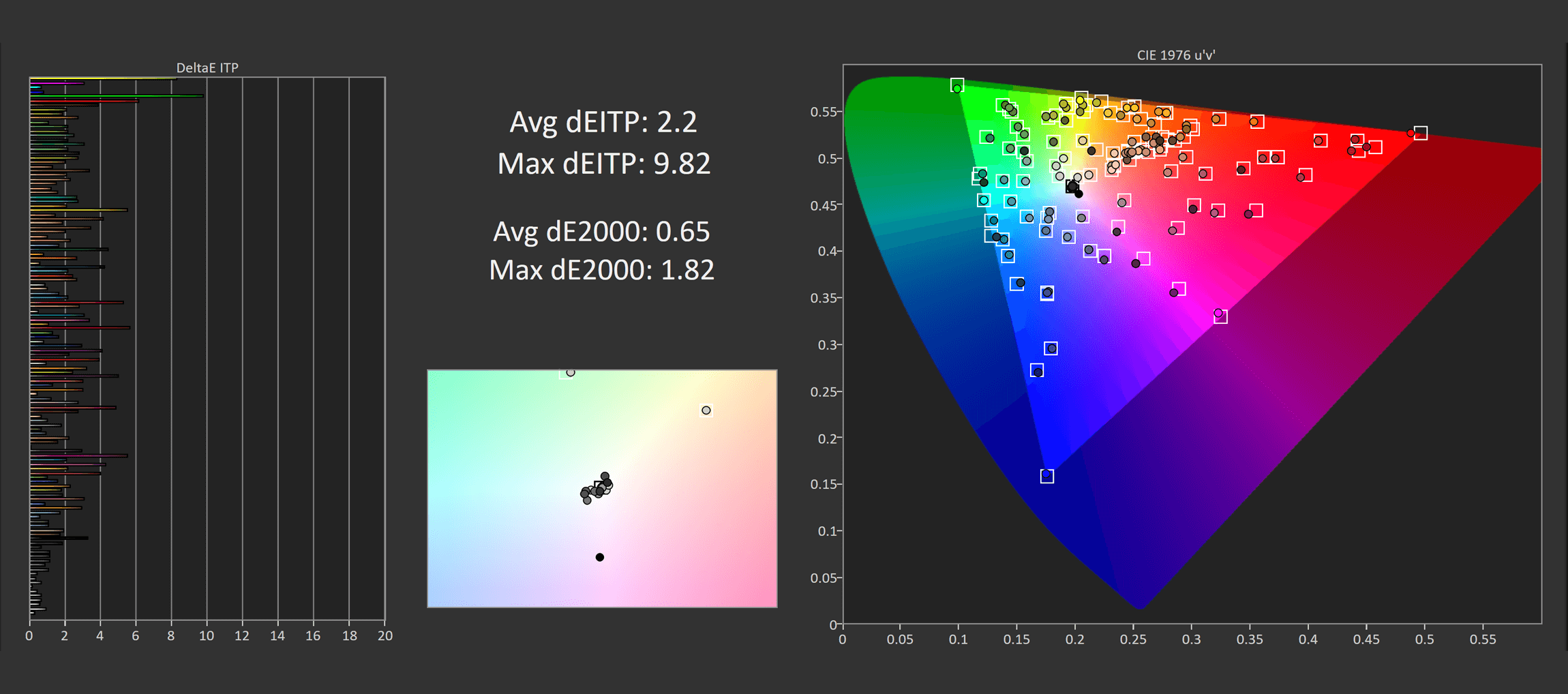 Out of the box, the UDCP is slightly less accurate than the UCDM in greyscale, with the LG variant sitting between the two models. While this is a pretty good result overall, the latest crop of 4K OLEDs have all come with above-average calibration, so it's tougher to stand out from the pack. In ColorChecker, it's much of a muchness.