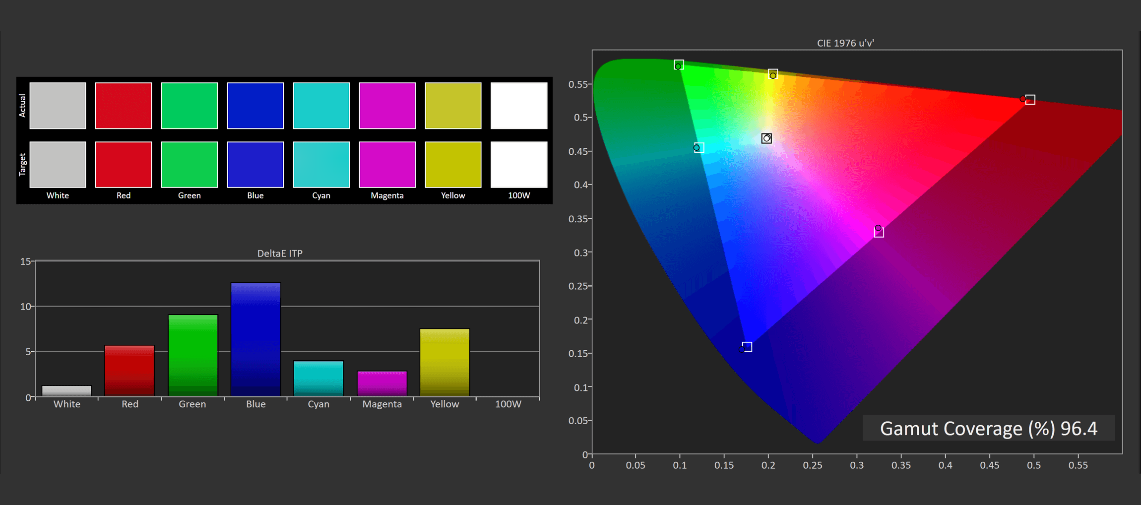 The UCDP has great factory calibration for the most part. In its default out-of-the-box configuration, greyscale performance is good, with an accurate color temperature and small issues with gamma. Like a lot of wide gamut gaming monitors, the color space is left unclamped for SDR use, leading to oversaturation in content like YouTube videos.