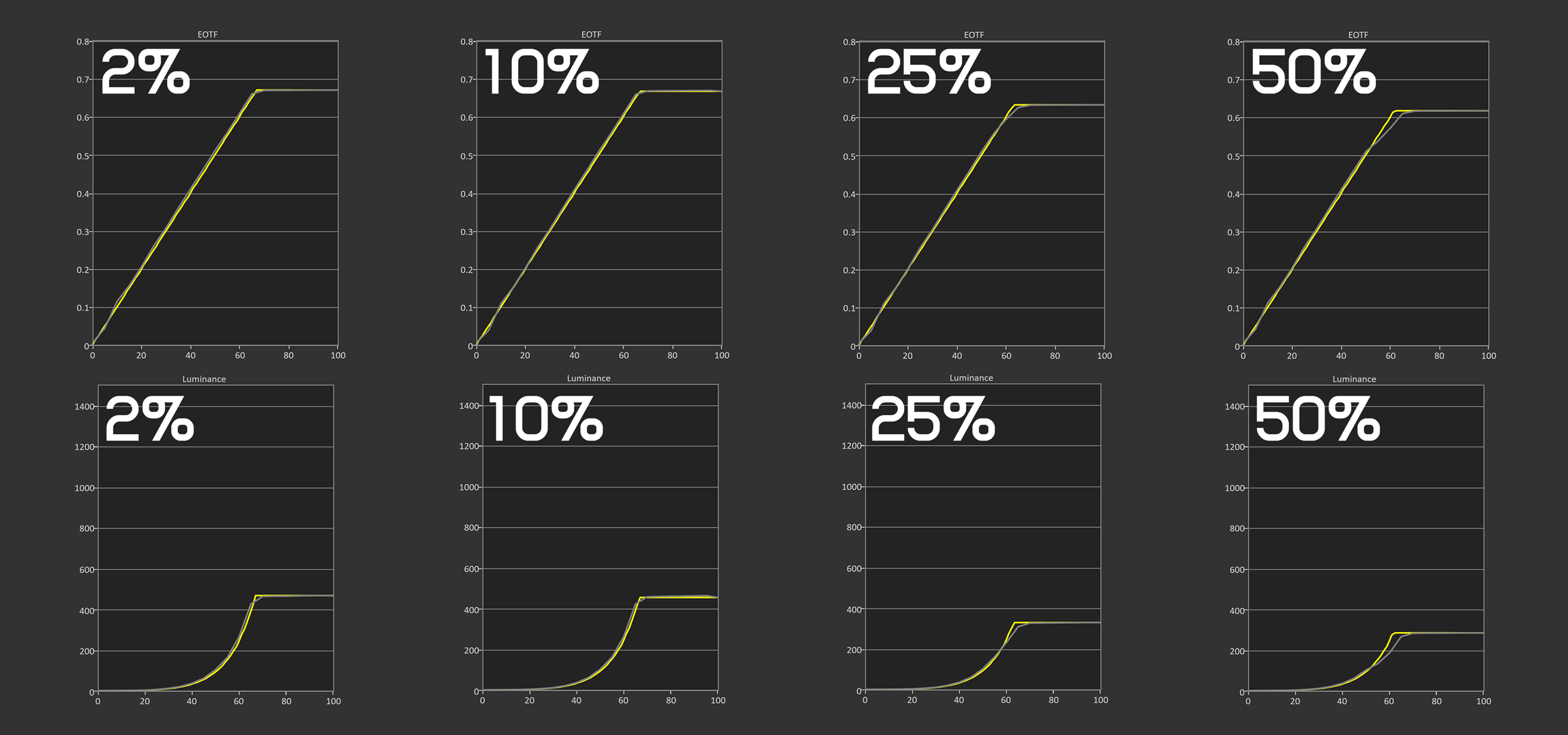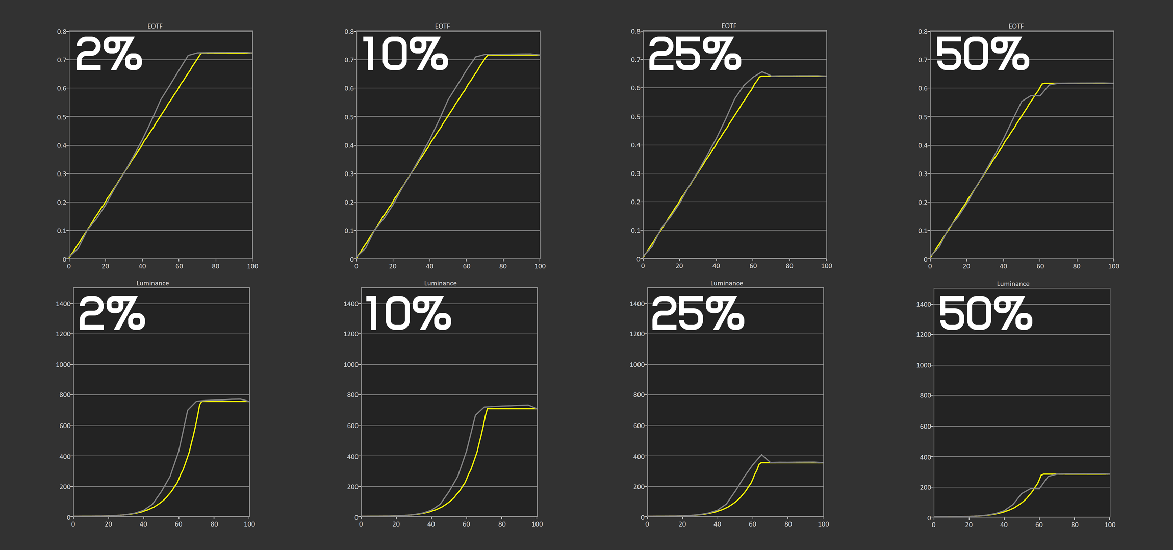 In synthetic brightness tests, full screen brightness is very similar between all OLED models. When we look at 10% window brightness, both Console HDR configurations hit nearly 800 nits, which is much brighter than QD-OLED and similar to the latest range of WOLEDs. However, the True Black mode lags behind at just 470 nits. Then, for 2% brightness, the PG32UCDP is one of the brightest monitors around, pumping out 1,200 nits, slightly higher than the LG model and around 20% brighter than QD-OLED competitors.