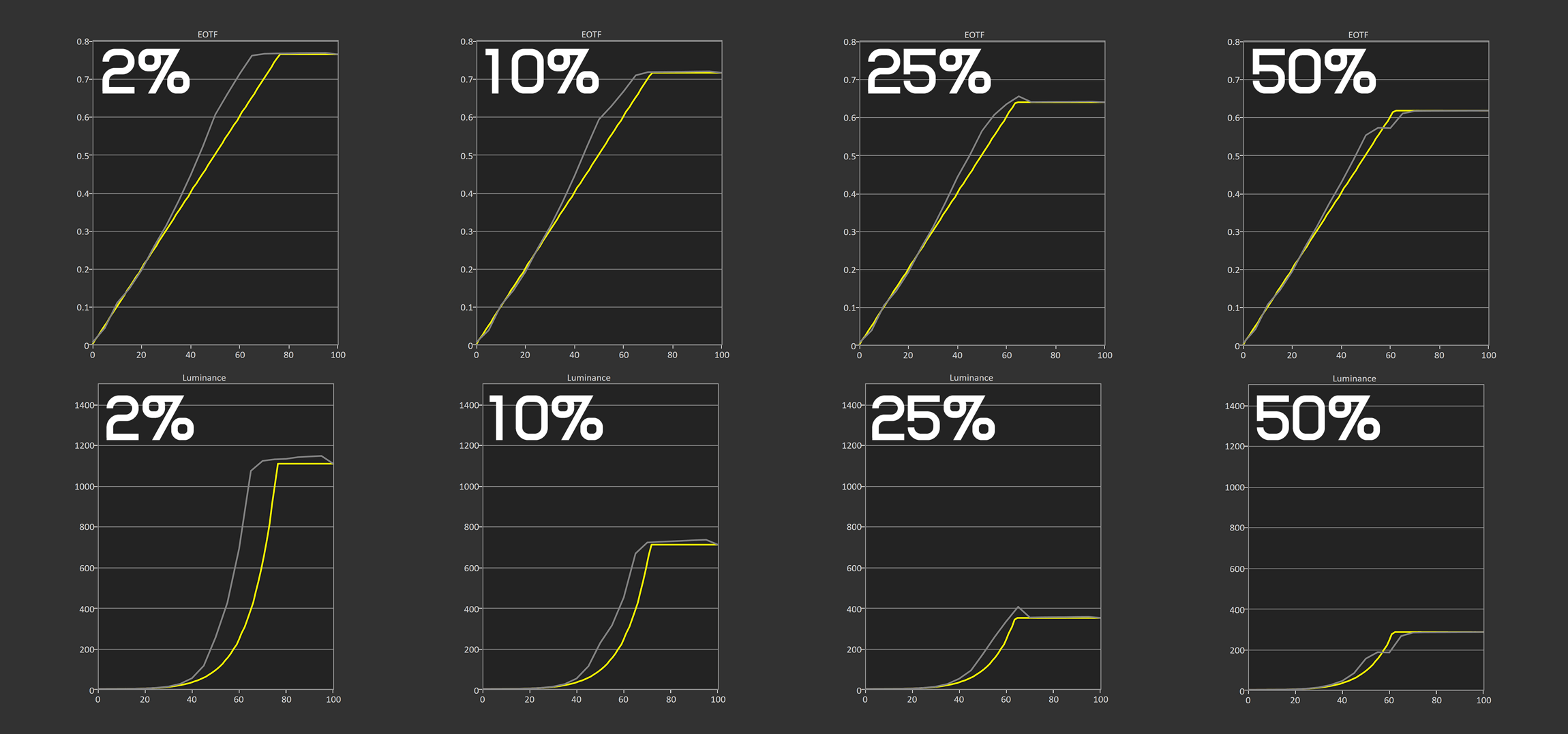 On the other hand, the UDCP does deliver decent performance in some areas. In high APL scenes, the UDCP is actually better overall than some of the QD-OLED 'brightness boost' configurations we've seen, such as Gigabyte's Gaming HDR mode in the FO32U2P, because it doesn't massively increase low APL scene brightness. The balance being struck here between all aspects of HDR is better if still compromised. Also, Asus has calibrated their models' HDR performance better than LG did with the 32GS95UE, which in its high brightness configuration is too bright for a much larger portion of the EOTF range.