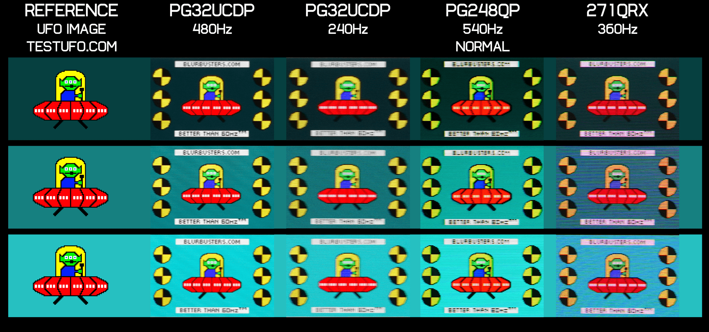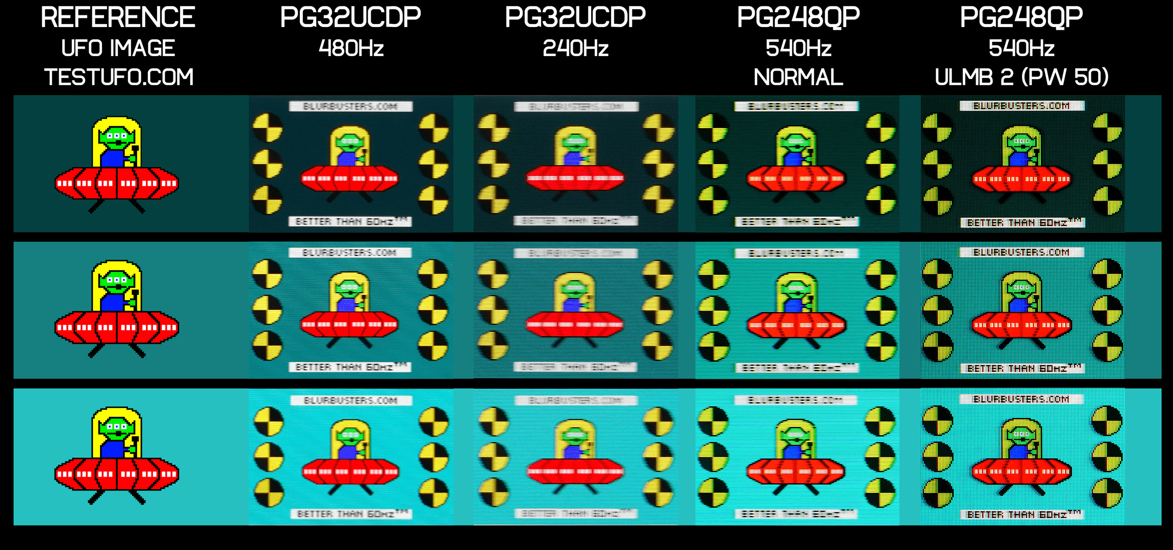 What's of most interest with this mode is motion clarity. At 480Hz with no black frame insertion, this is a very clear monitor, a step better than what we've seen from 1440p 360Hz QD-OLEDs recently. Looking at the Blur Busters UFO Test, the text, for example, is the most readable it's ever been, even in comparison to the 540Hz TN LCD PG248QP. Given you get this clarity with full adaptive sync and HDR support, we'd say this is the most versatile and possibly the best high motion clarity mode we've tested yet. With OLED typically offering around a 1.5x clarity boost compared to LCD at the same refresh rate, what we're seeing here should be equivalent to an LCD operating above 700Hz.