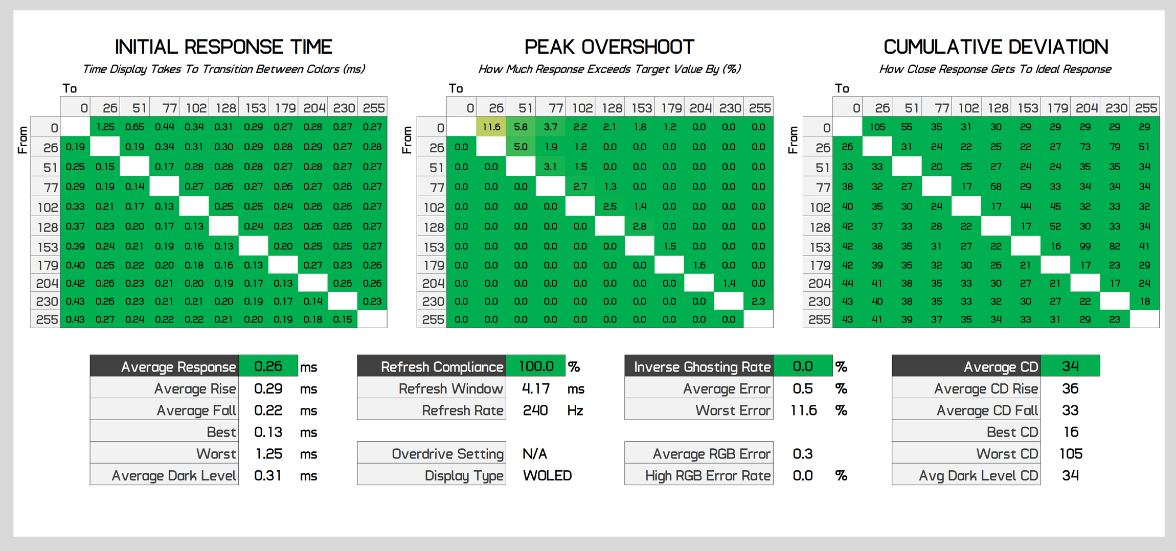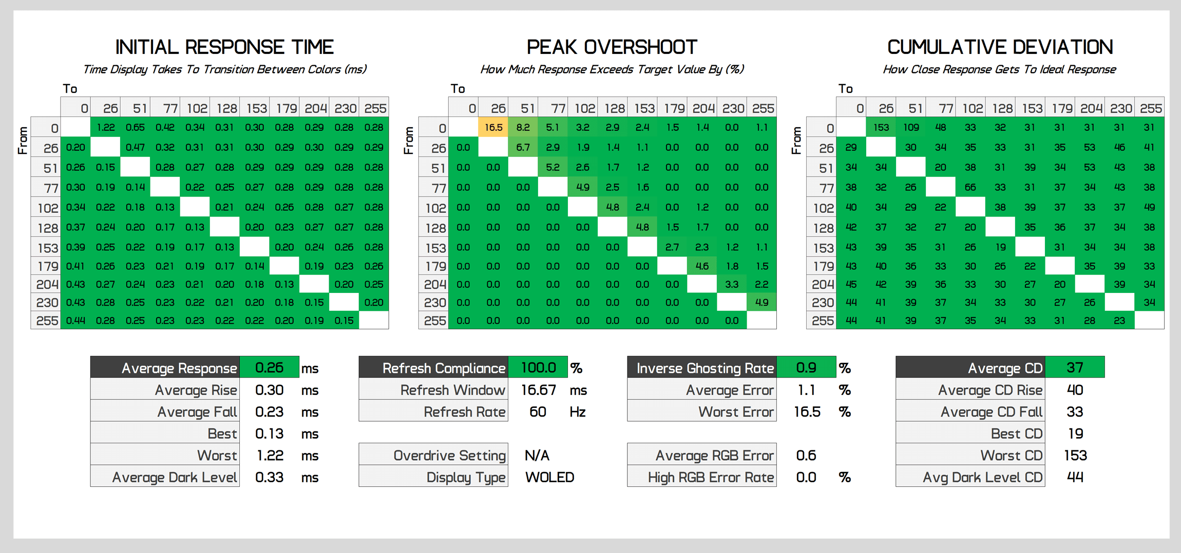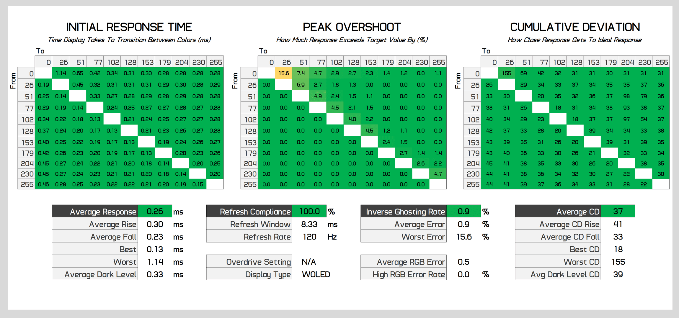 OLEDs also maintain the same performance at all refresh rates, so even when testing at 120Hz or 60Hz, we see similar results in the 0.3ms range. This is a nice benefit for variable refresh rate gamers, resulting in a single overdrive mode experience; in contrast, many LCDs typically perform worse at lower refresh rates relative to their maximum refresh.