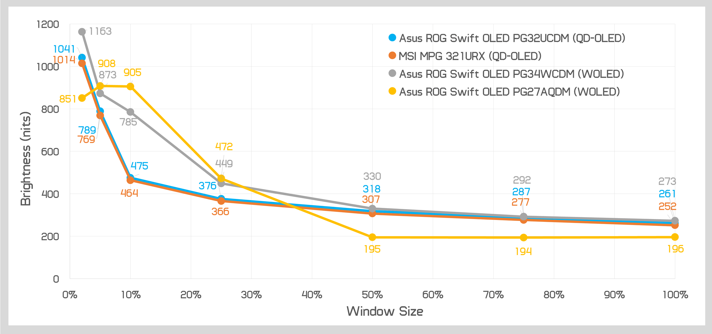 Here's the full brightness vs window size chart and really I don't think there are any surprises here. Brightness is very slightly lower than the Asus model overall, and depending on window size and the exact monitor we're looking at, brightness is either better or around the mark of WOLEDs. Of course I'm referring here to white brightness, color brightness is still superior on QD-OLED as it has a much higher color volume.
