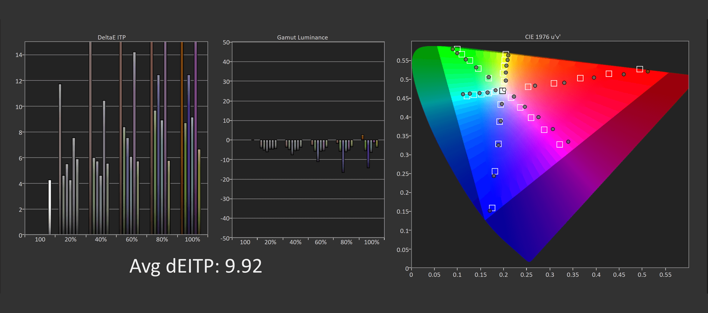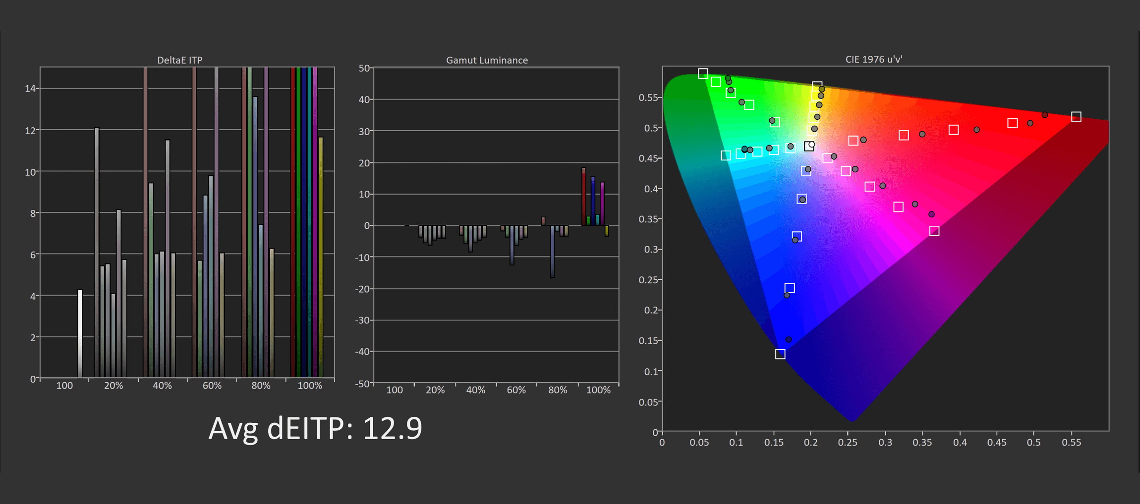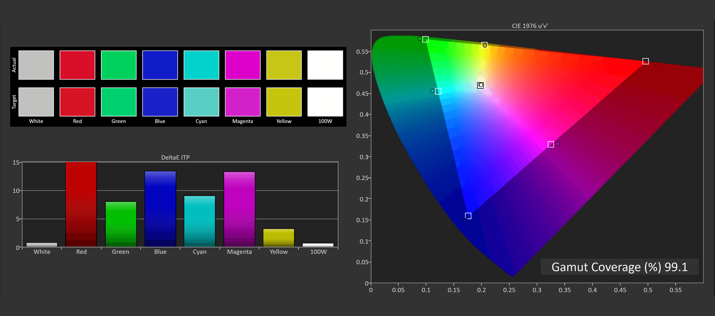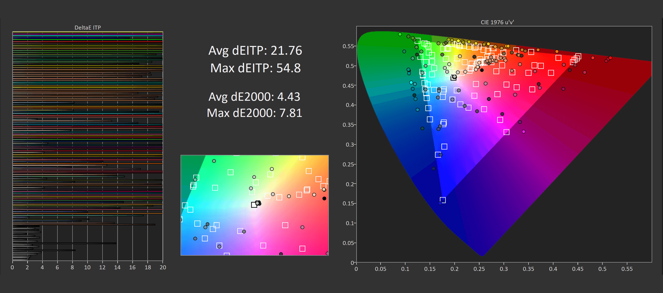 Calibration can be improved slightly through a full Calman pass, though for most users I think the sRGB mode will be sufficient for SDR apps. Calibration in this way is more useful for those that need wide gamut support, as it can tidy up things there and with 99% coverage of DCI-P3 you can get pretty good results if you want to work in that gamut, burn in risk aside.