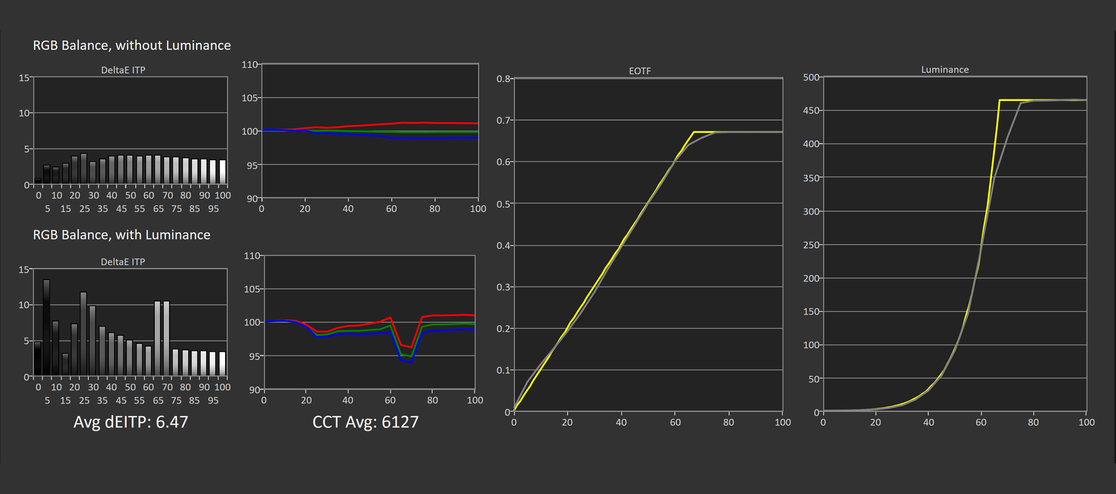 However the good news it the sRGB mode has excellent accuracy. Grayscale performance is fantastic with very good tracking of the sRGB gamma curve and a good color temperature, leading to low deltaEs. When looking at saturation and ColorChecker charts we also see great gamut clamping and nice tuning for the color primaries, so overall calibration in this mode is excellent. At least for my unit this means the locked setting issue is less annoying, but I'd still like to see all settings available here just in case other units don't ship quite as well calibrated.