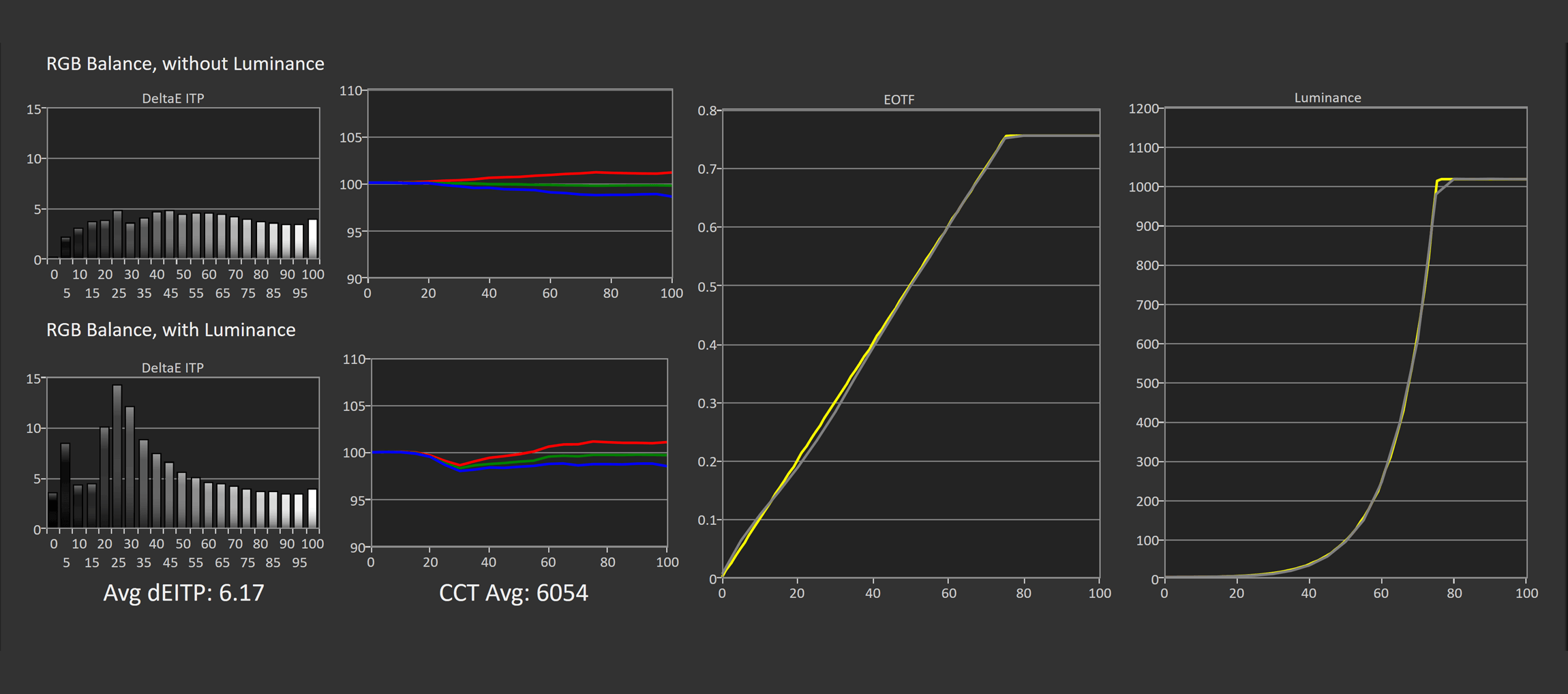 Accuracy in the 1000 nit mode is great, with nice tracking though roll-off occurs a little too early when testing at a 10% APL. Still, the most important part of the luminance curve to get right is the lower part, which most content uses the heaviest, and here the MSI model has excellent tracking, as seen in the dark tracking charts. When testing at a 2% window size instead of 10%, we see brightness now reaches 1000 nits, and accuracy is very good here, even better than at 10%. This suggests to me that MSI focused their efforts on calibration at 2% compared to 10%; the reverse is true for the competing Asus model where 10% APL accuracy is better than 2%.