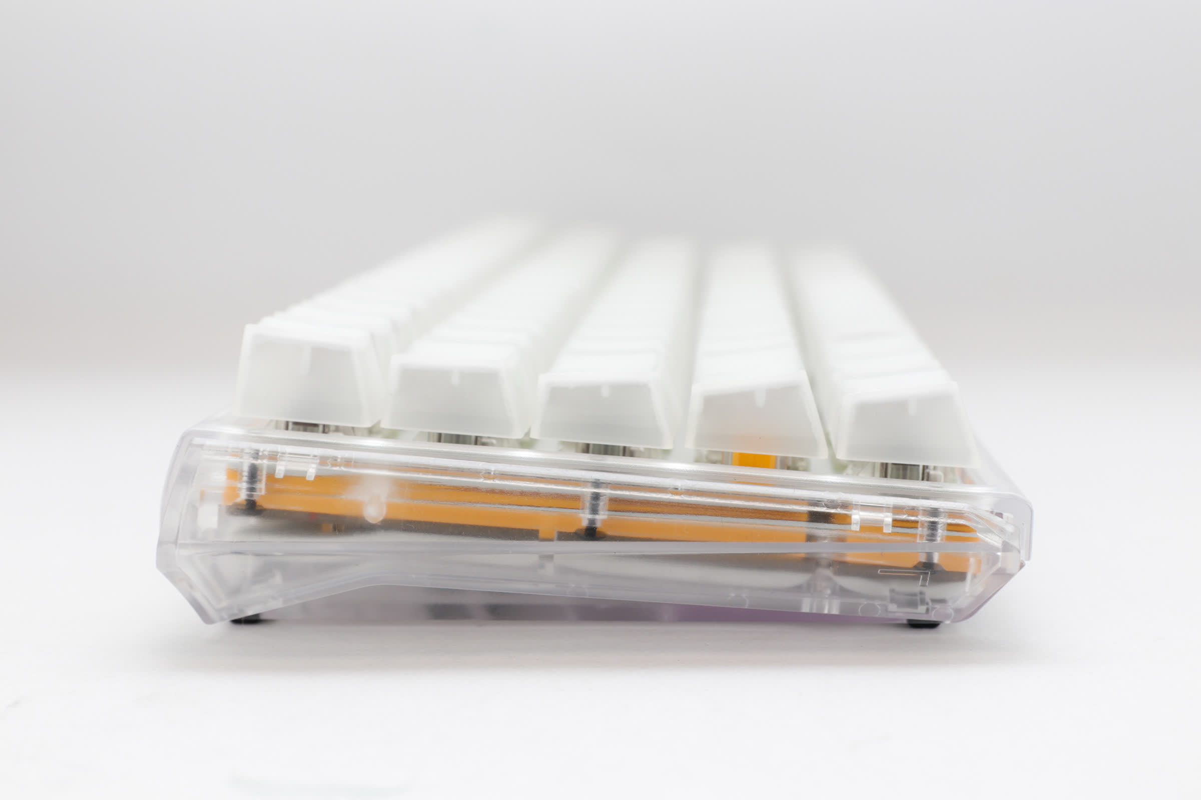 The unique design comprises a frosted plastic translucent body and translucent switches, letting you see the yellow foam that dampens the keystrokes, along with some of the dual-layer PCB, from the sides.