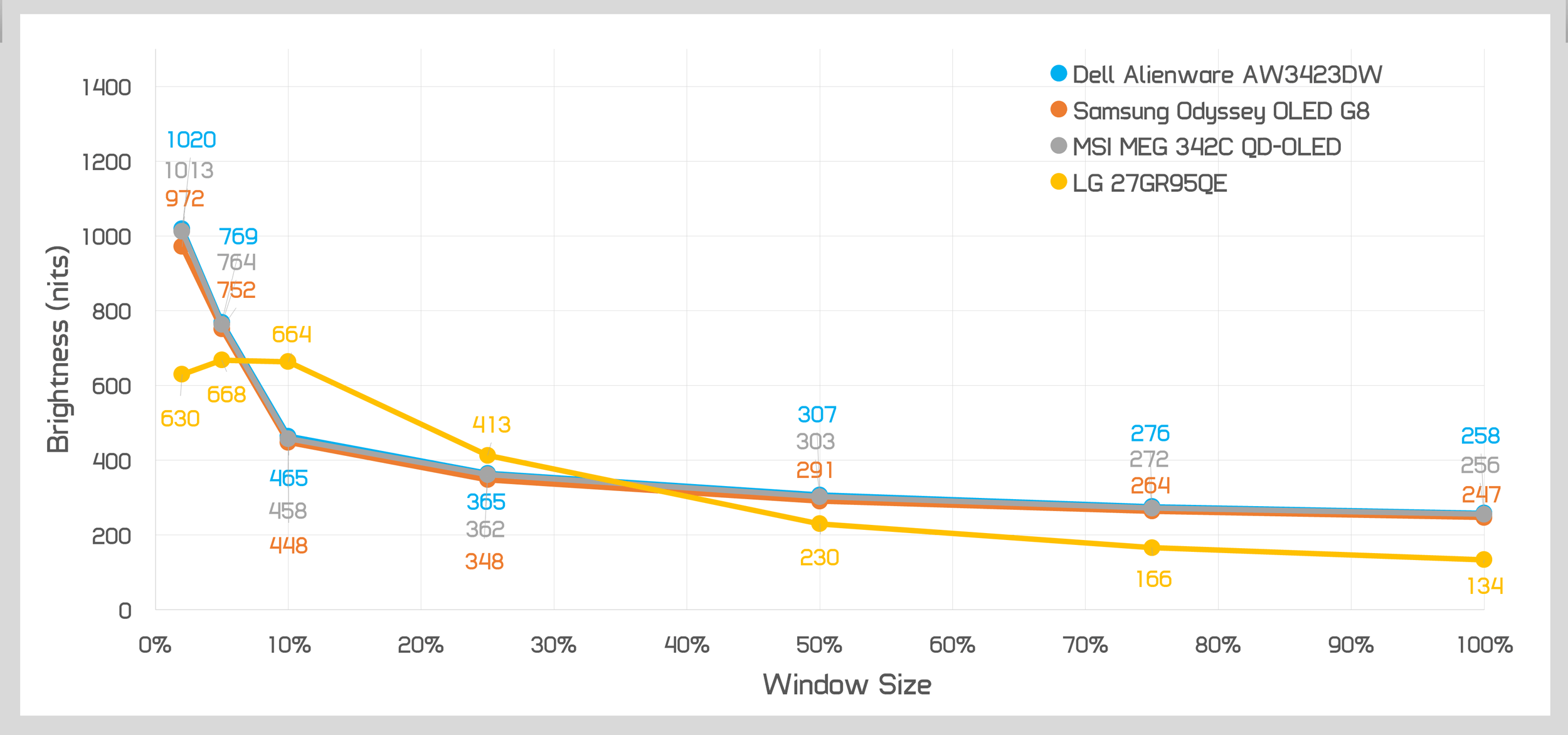 It's really only for smaller elements that this QD-OLED panel is capable of hitting high levels of brightness, for example we get 750 nits at a 5% size and 970 nits at a 2% size. This definitely gives the G8 the capabilities to show dazzling bright highlights, but if large portions of the screen are bright then this monitor isn't especially bright relative to others.