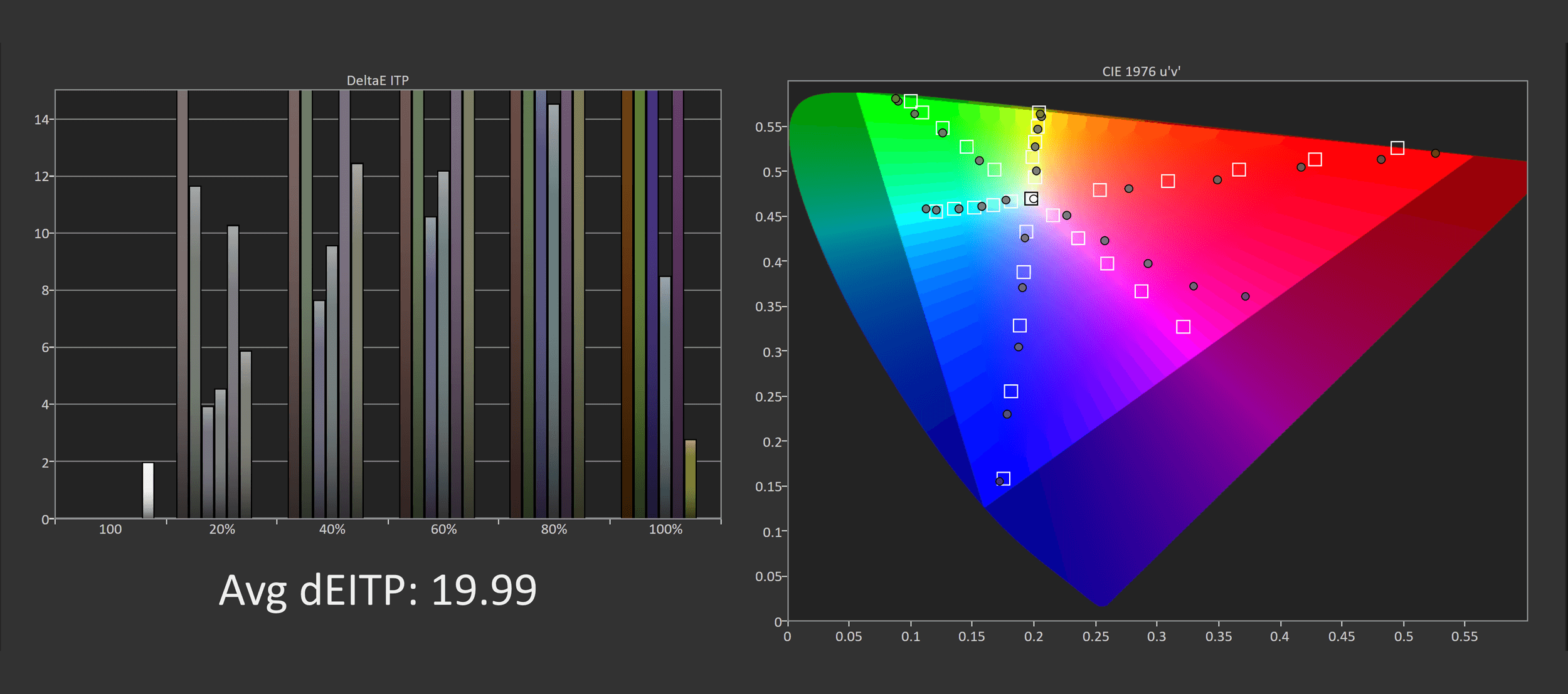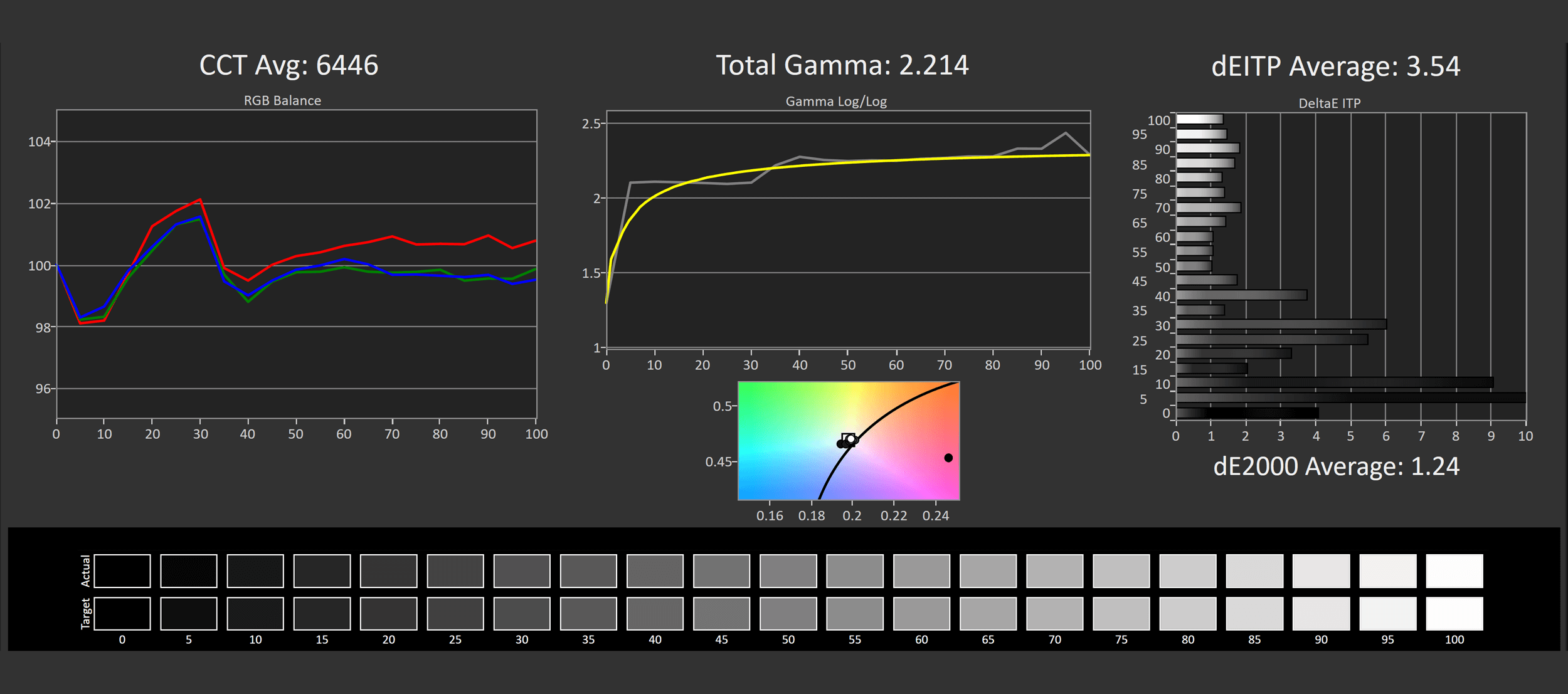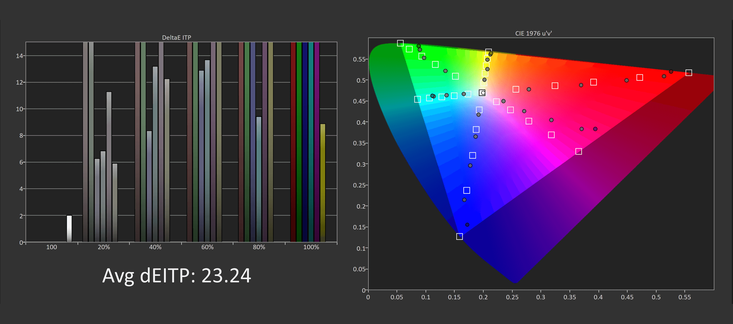 With only changing this one setting, we get excellent performance for SDR sRGB content. Greyscale performance is still great, but now the color gamut sticks to sRGB, we get no oversaturation and delta Es are very good at below 5.0 for deltaE ITP in ColorChecker. This result is as good as what we see from the Alienware AW3423DWF's sRGB mode, and better than the other options.