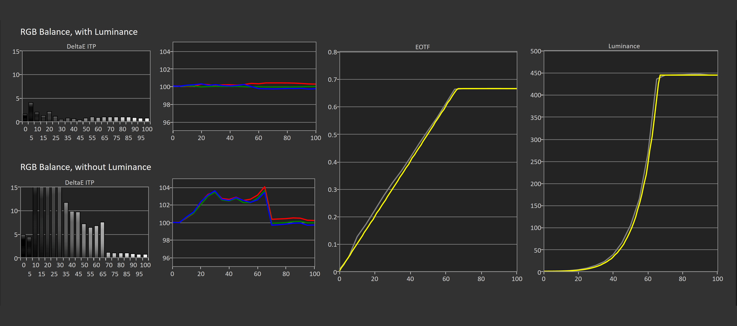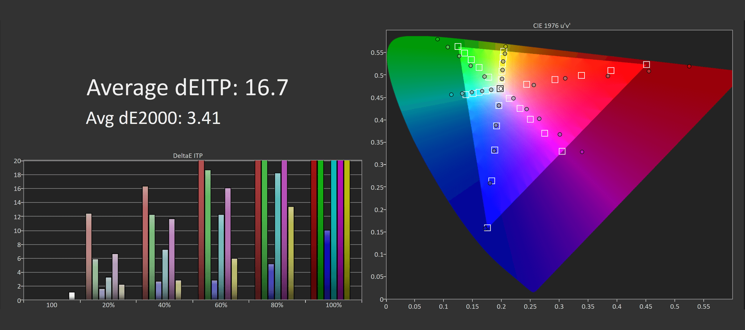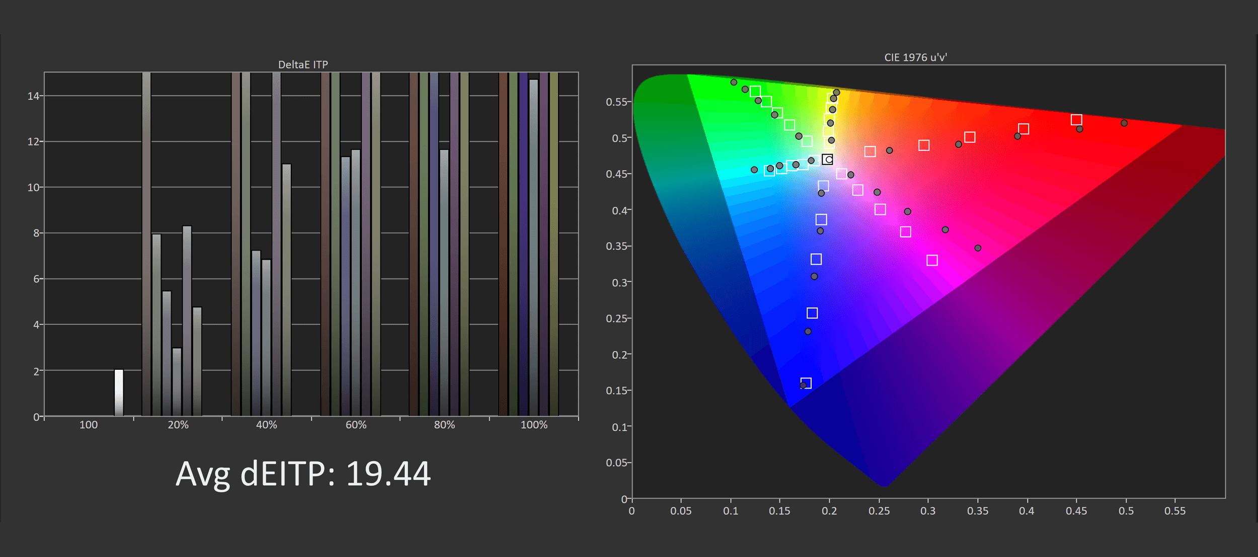 With only changing this one setting, we get excellent performance for SDR sRGB content. Greyscale performance is still great, but now the color gamut sticks to sRGB, we get no oversaturation and delta Es are very good at below 5.0 for deltaE ITP in ColorChecker. This result is as good as what we see from the Alienware AW3423DWF's sRGB mode, and better than the other options.