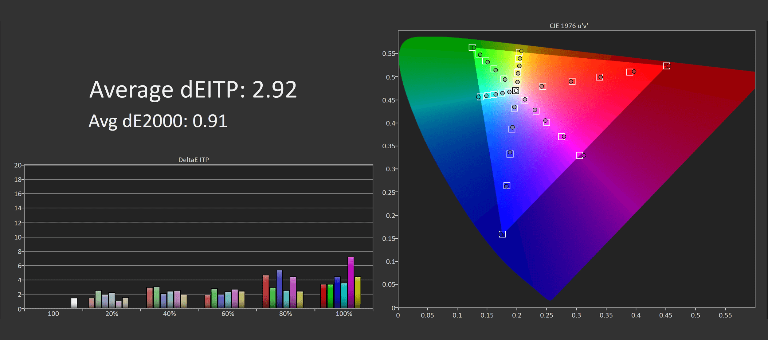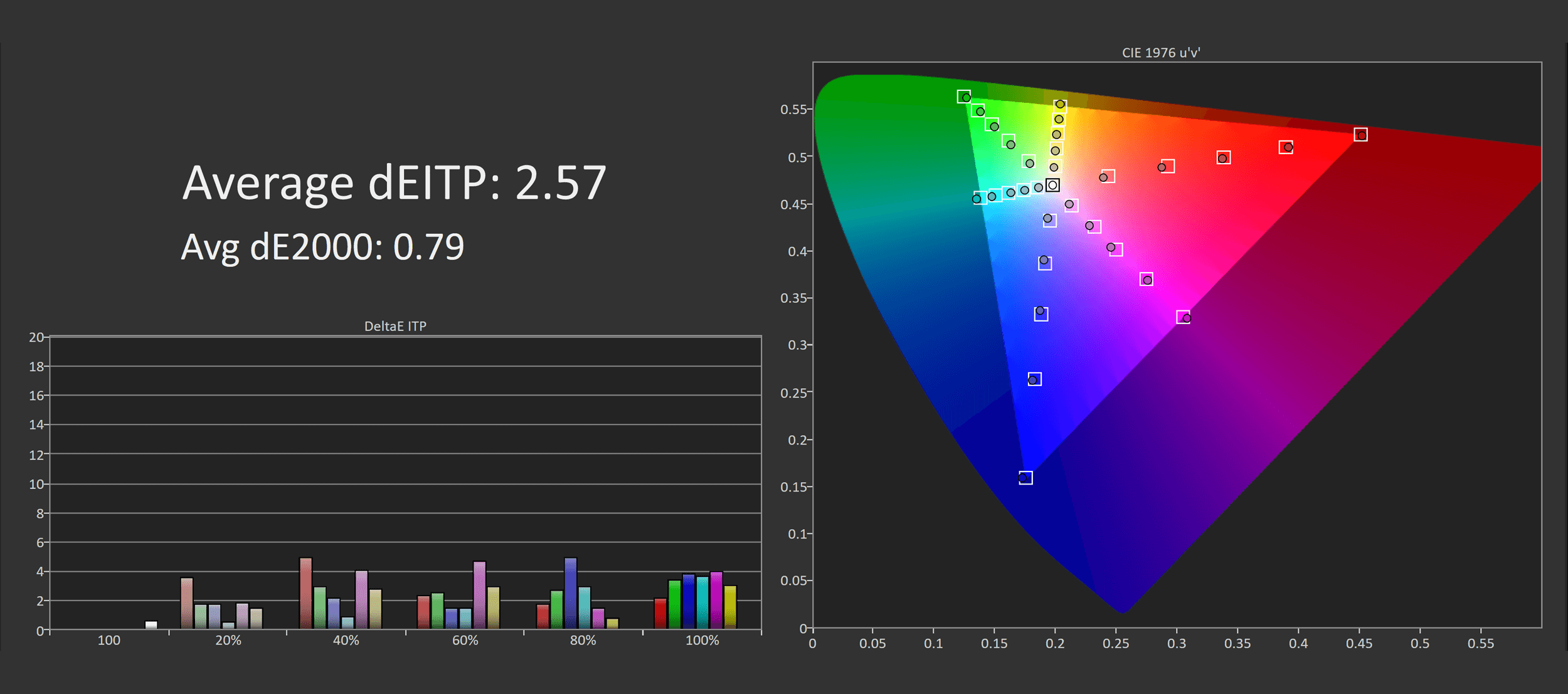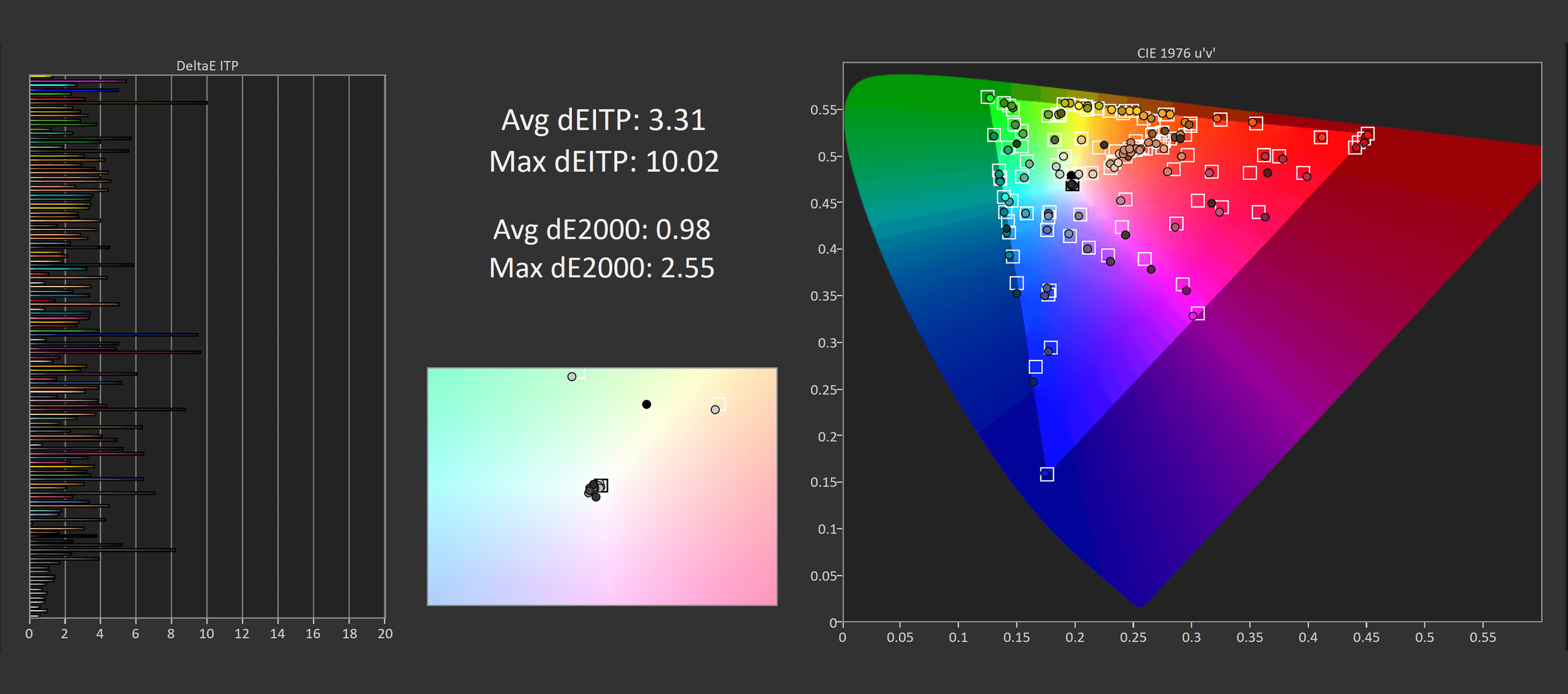 In total we get 80.6% coverage of Rec.2020 which is among the widest gamuts I've tested, though similar to other QD-OLEDs. This provides a nice range colors that can be used while HDR gaming.