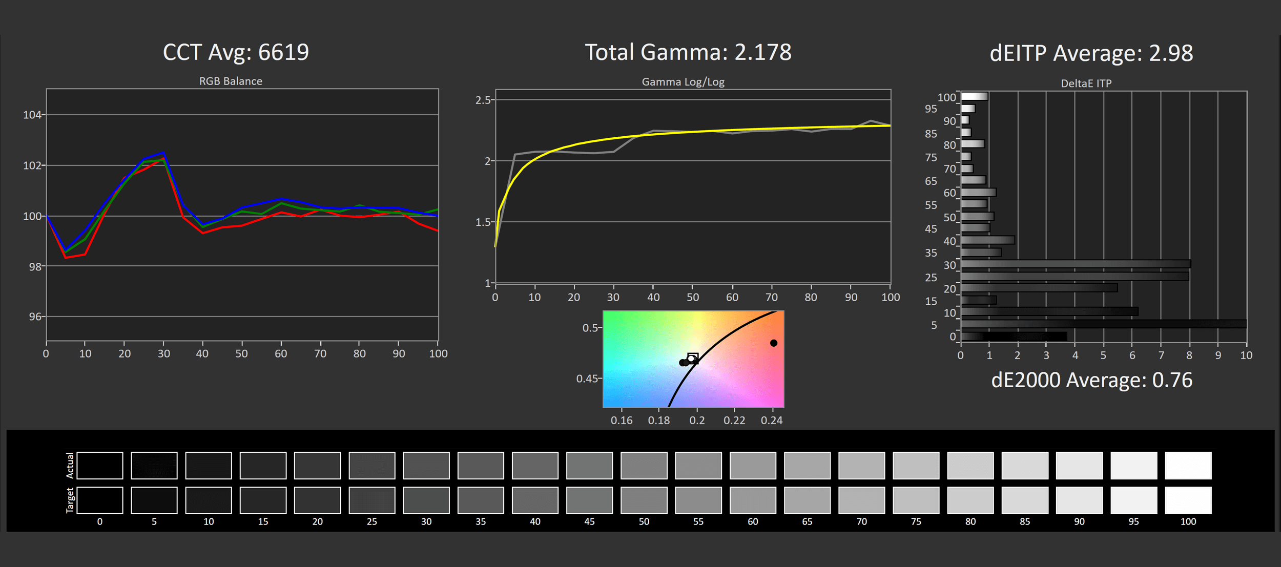When compared to other monitors the OLED G8 is a class leader for factory greyscale calibration. ColorChecker is less solid, though similar to other QD-OLEDs and many wide gamut gaming displays.