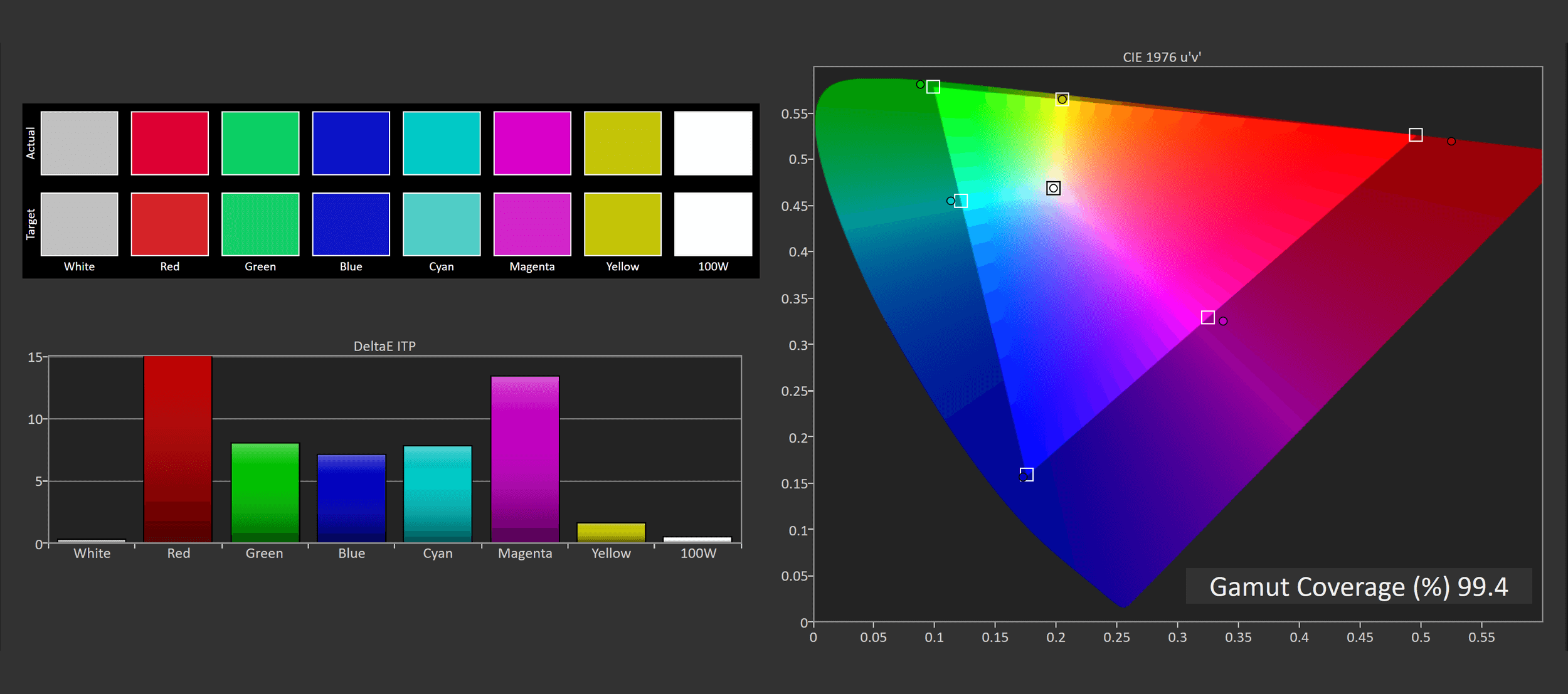 For color performance, the OLED G8 is a wide gamut monitor with quite high color space coverage. We get 99.4% coverage of DCI-P3, plus 97.1% coverage of Adobe RGB which is good - though this isn't really a product suitable for color critical productivity work.