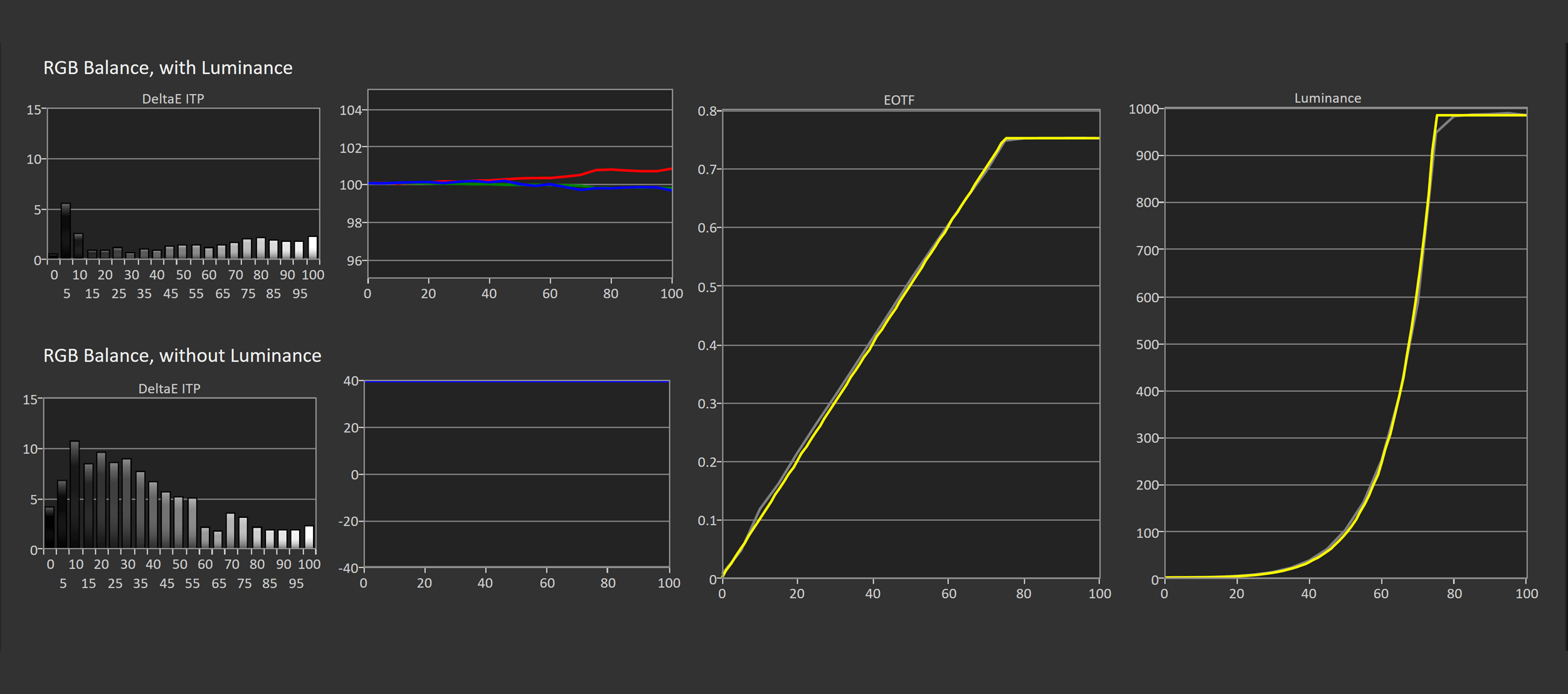 On AMD GPUs the "Game HDR" setting is greyed out, whereas on Nvidia that option is available, but when actually testing Nvidia performance I did not enable that setting and found it to reduce accuracy. Clearly this display is tuned differently depending on what sort of HDR pipeline is being used, and for whatever reason 1,000 nit performance is restricted on AMD GPUs - bizarre given this is not a G-Sync product, it's actually only branded as AMD FreeSync.