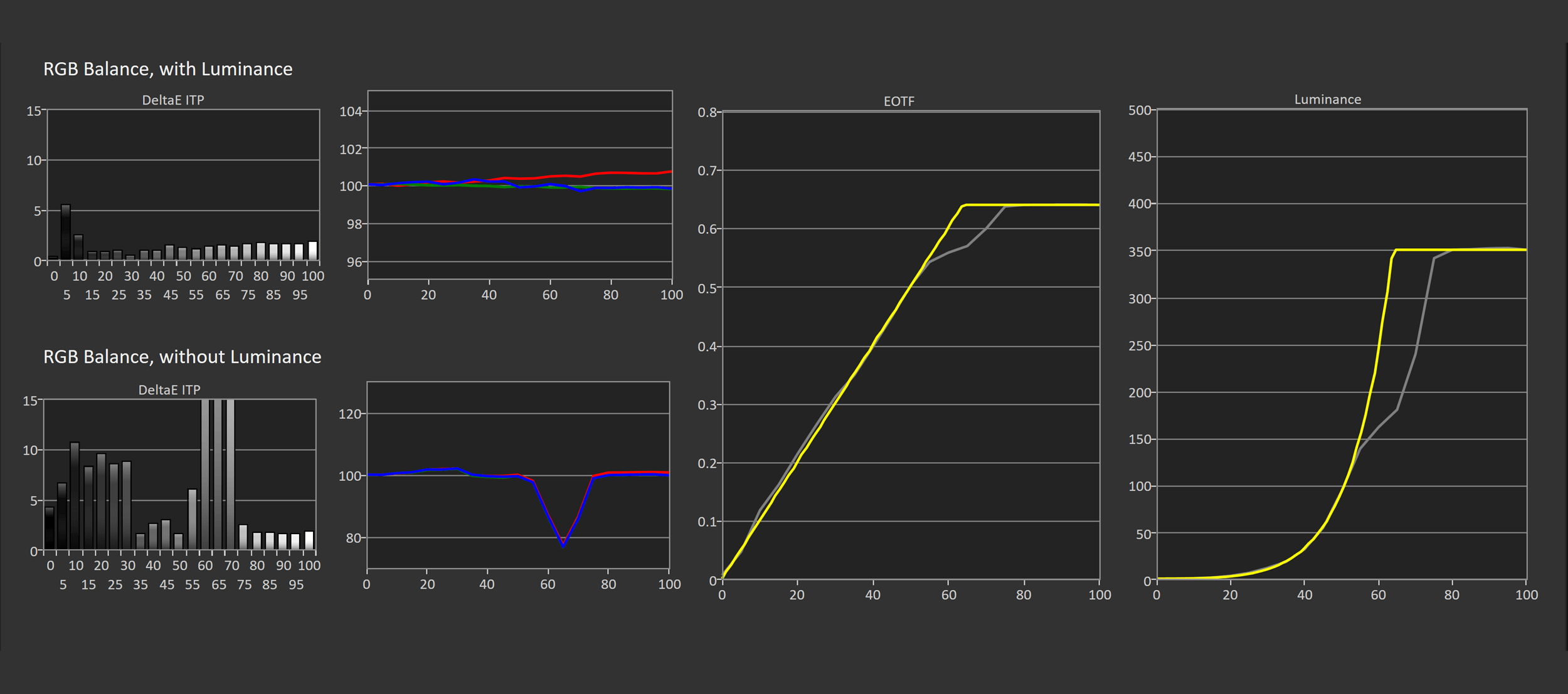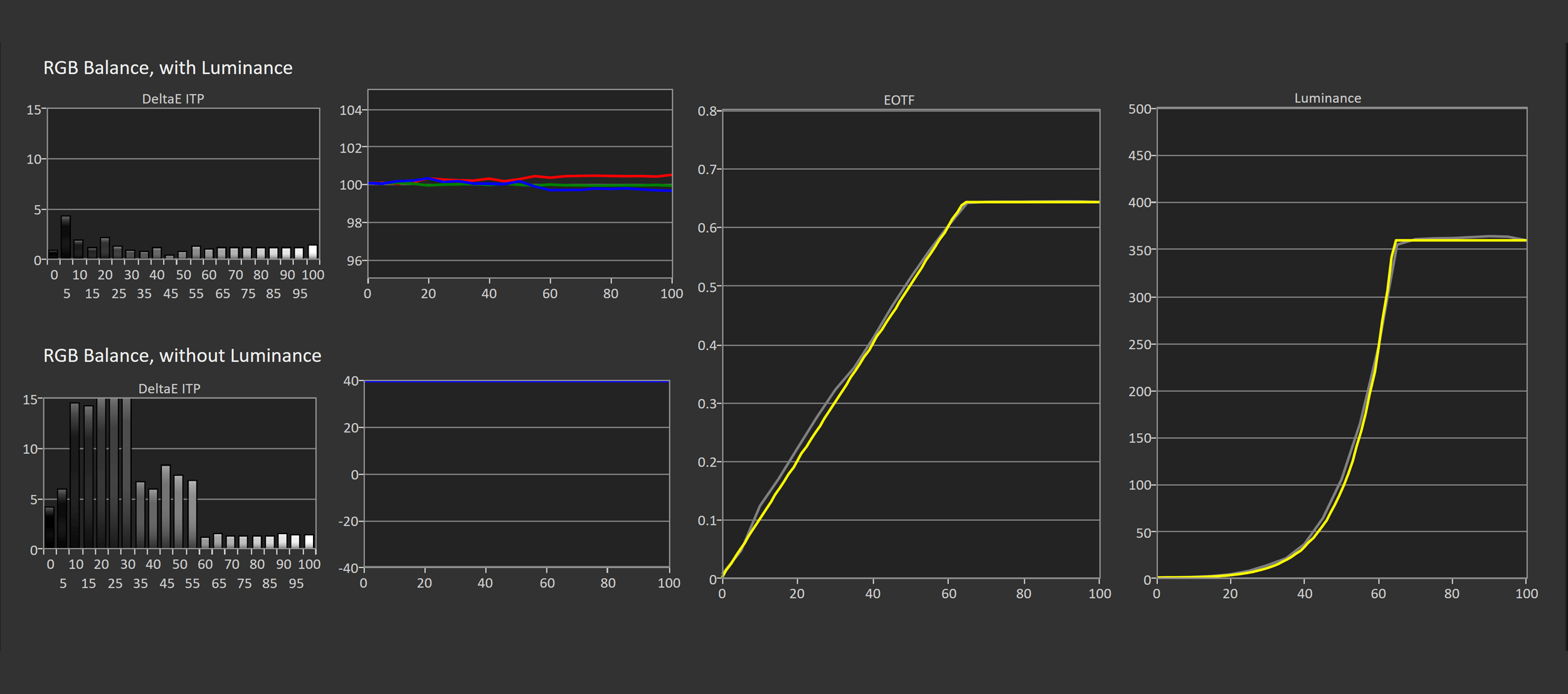 The G8 is the best of the four QD-OLEDs in terms of color accuracy and color performance capabilities. From the factory my unit had great grayscale performance, above average for a gaming monitor with a deltaE ITP of just 3.6 and excellent white balance. The monitor does ship without a gamut clamp enabled by default, so SDR content like YouTube videos will be oversaturated if you don't adjust any settings, leading to poor delta Es.