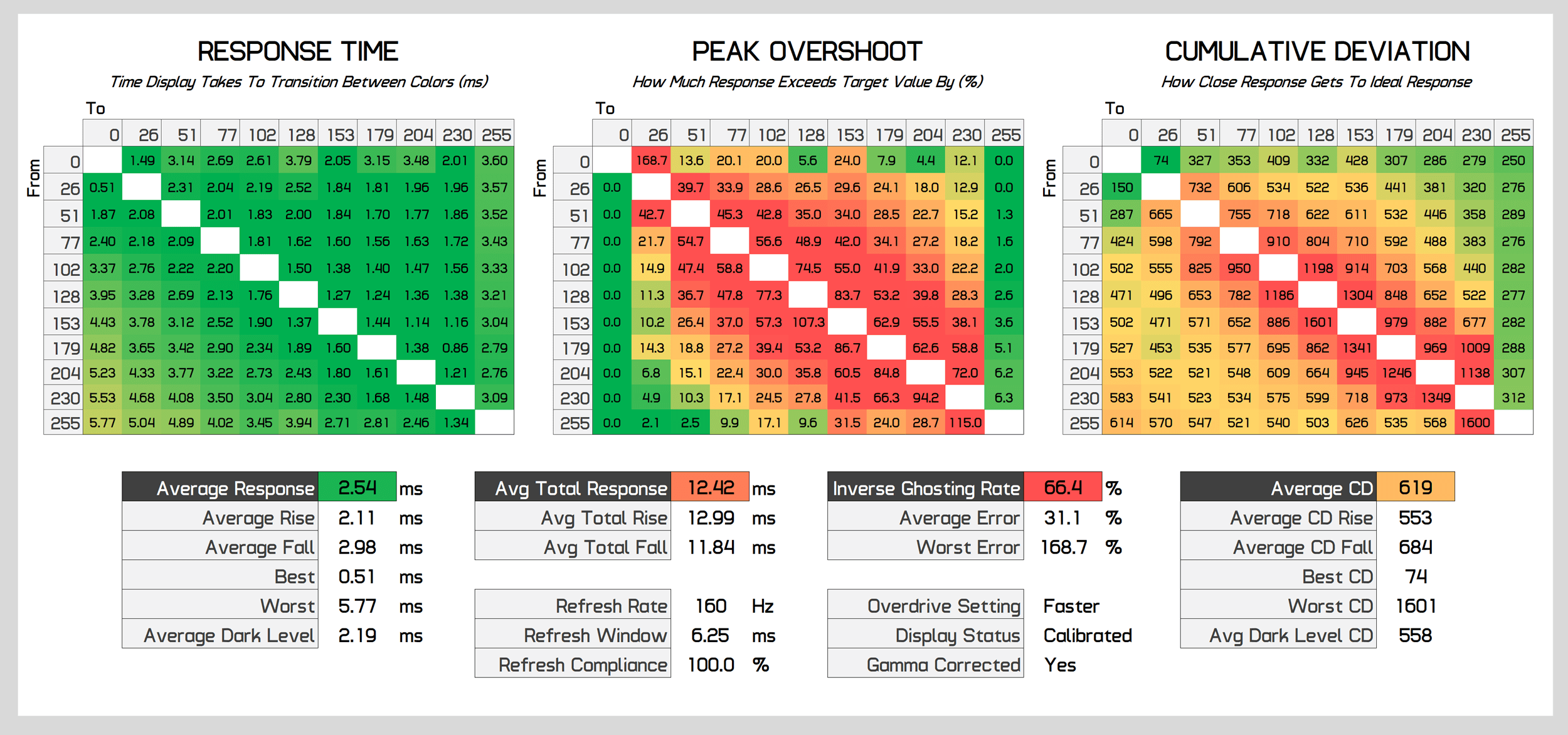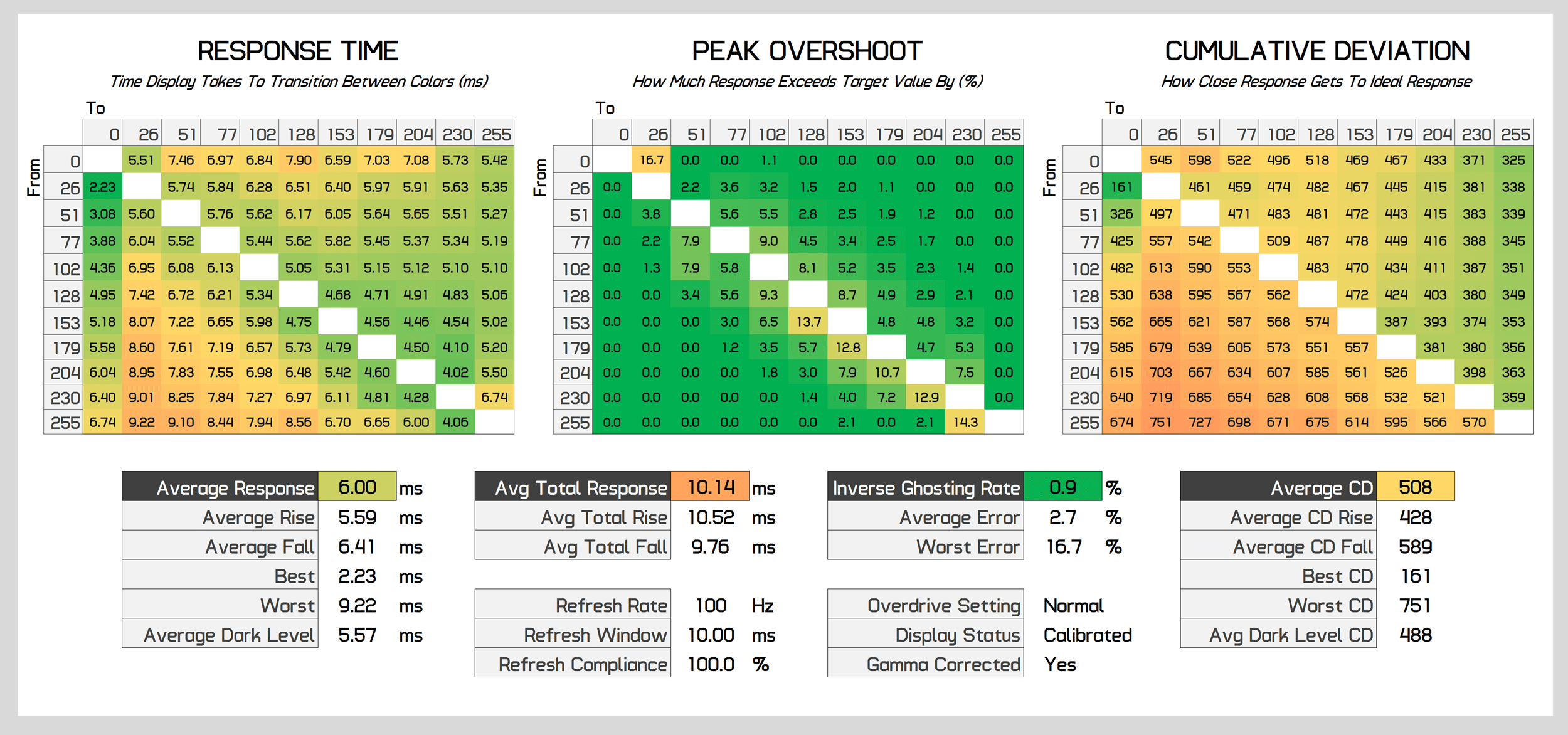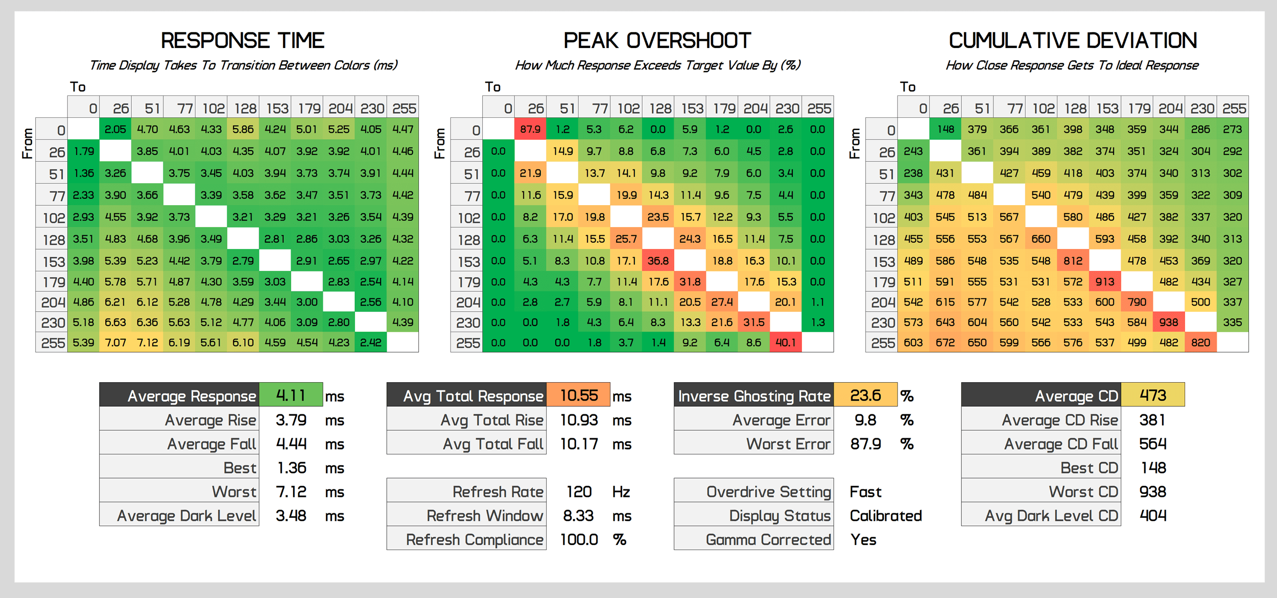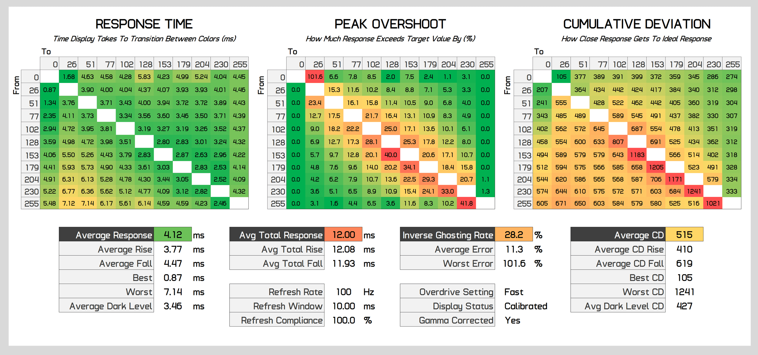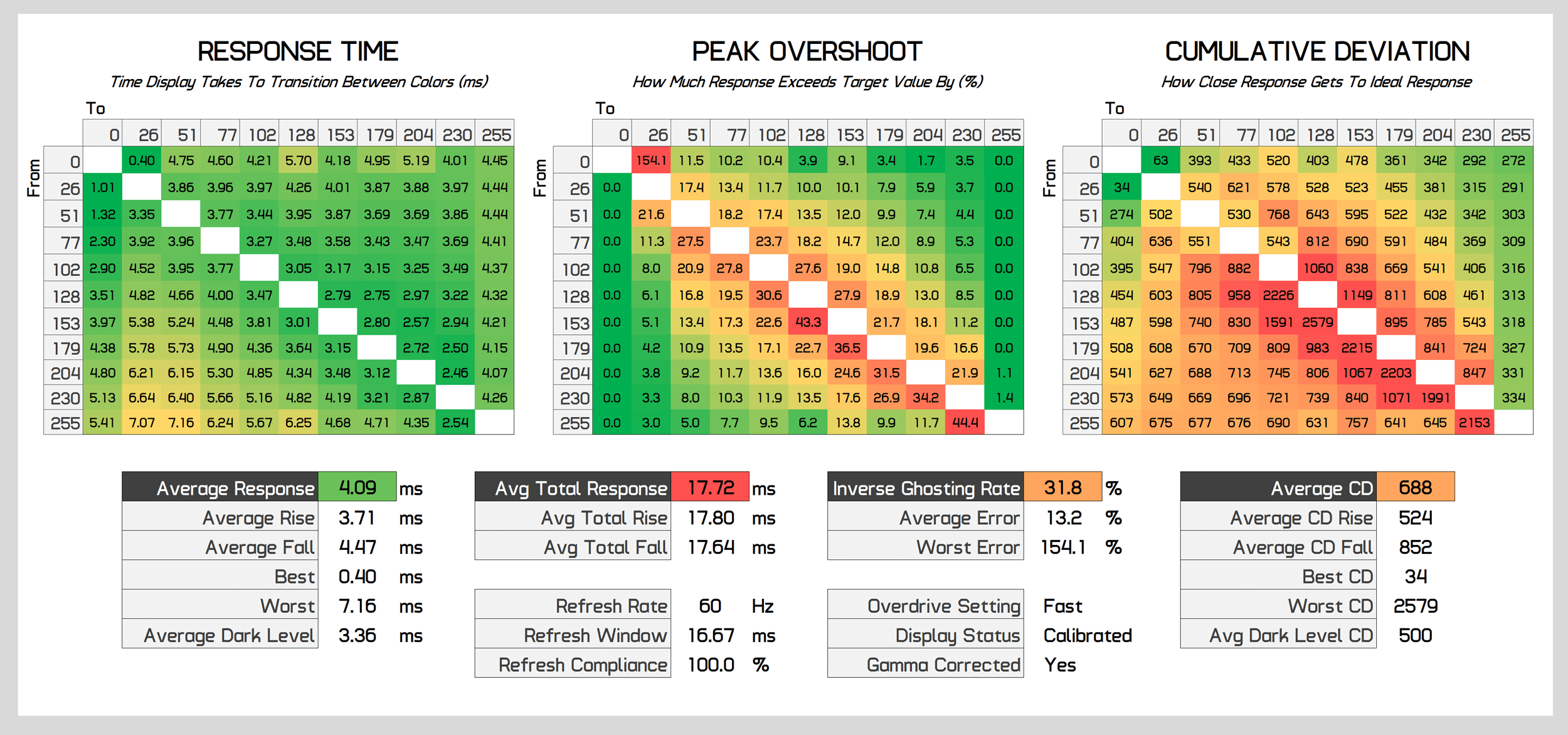 While at around 100Hz we start to see some inverse ghosting, it's minimal and even at 60Hz with a 32% inverse ghosting rate, the actual artifacts you'll see can be hard to spot - this is due to cumulative deviation figures that aren't wildly out of control on average. Across all these refreshes we see around 4ms response time performance which is really solid.