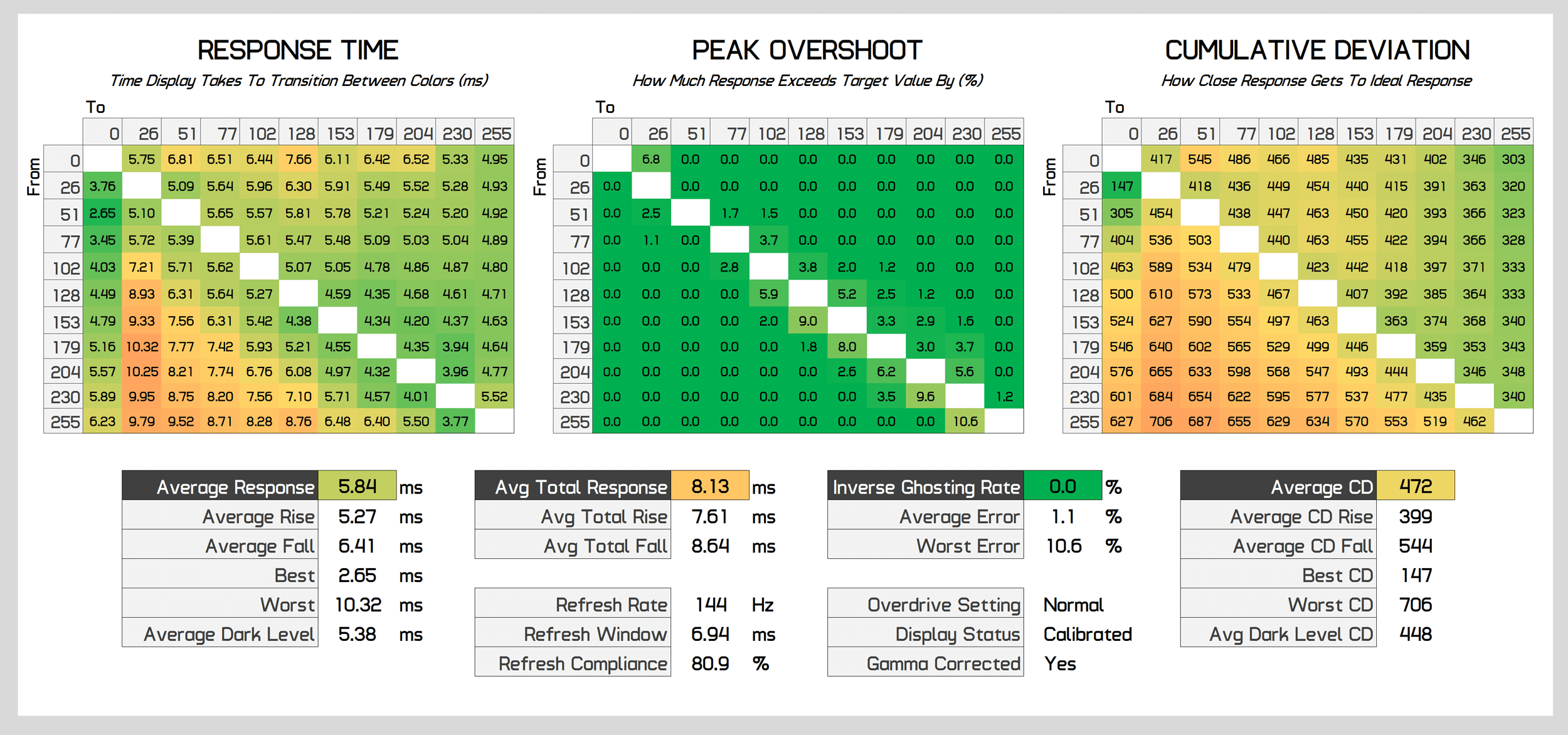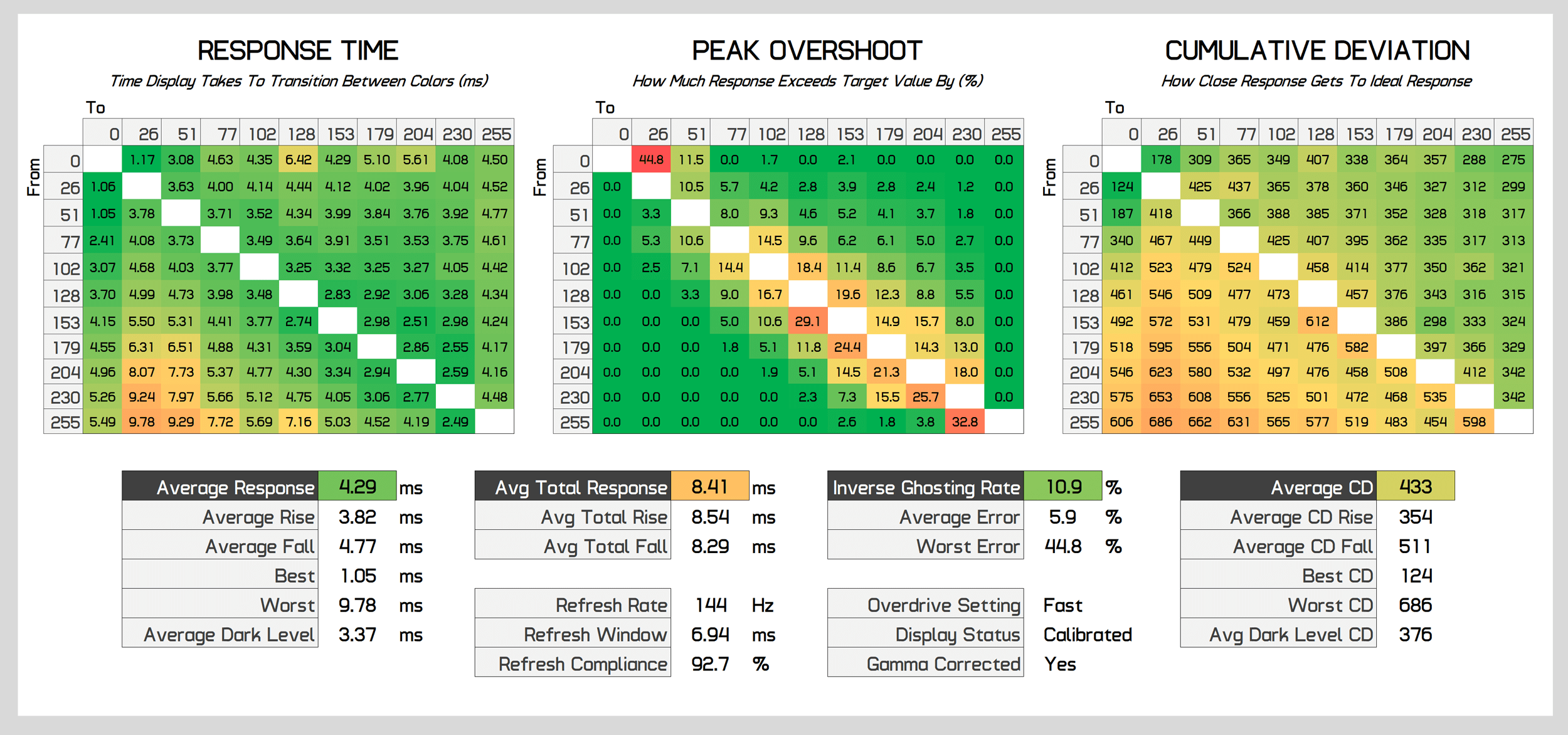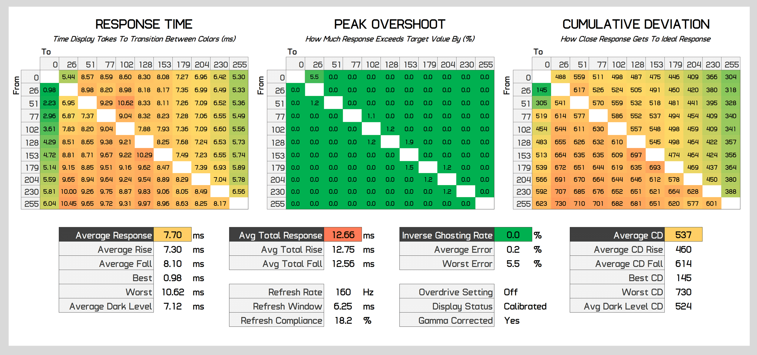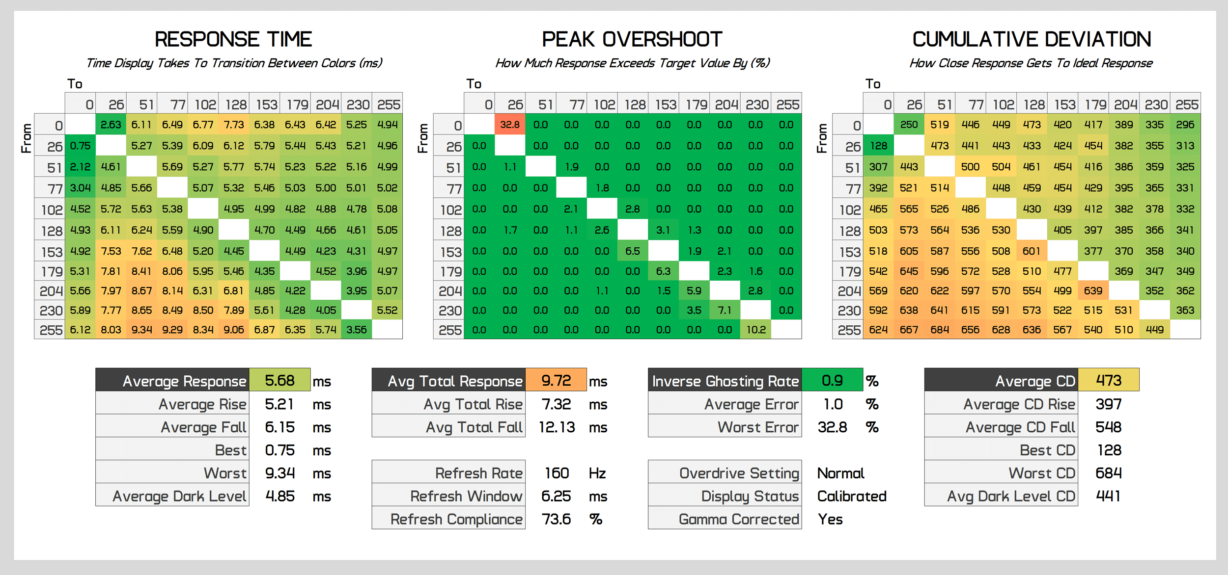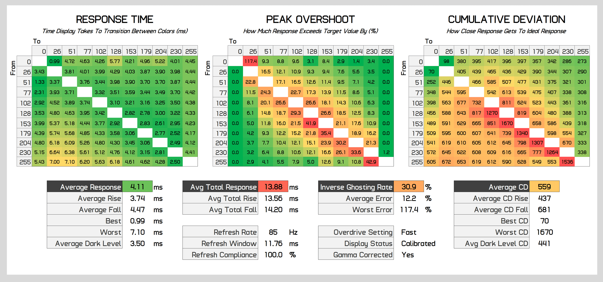 While at around 100Hz we start to see some inverse ghosting, it's minimal and even at 60Hz with a 32% inverse ghosting rate, the actual artifacts you'll see can be hard to spot - this is due to cumulative deviation figures that aren't wildly out of control on average. Across all these refreshes we see around 4ms response time performance which is really solid.
