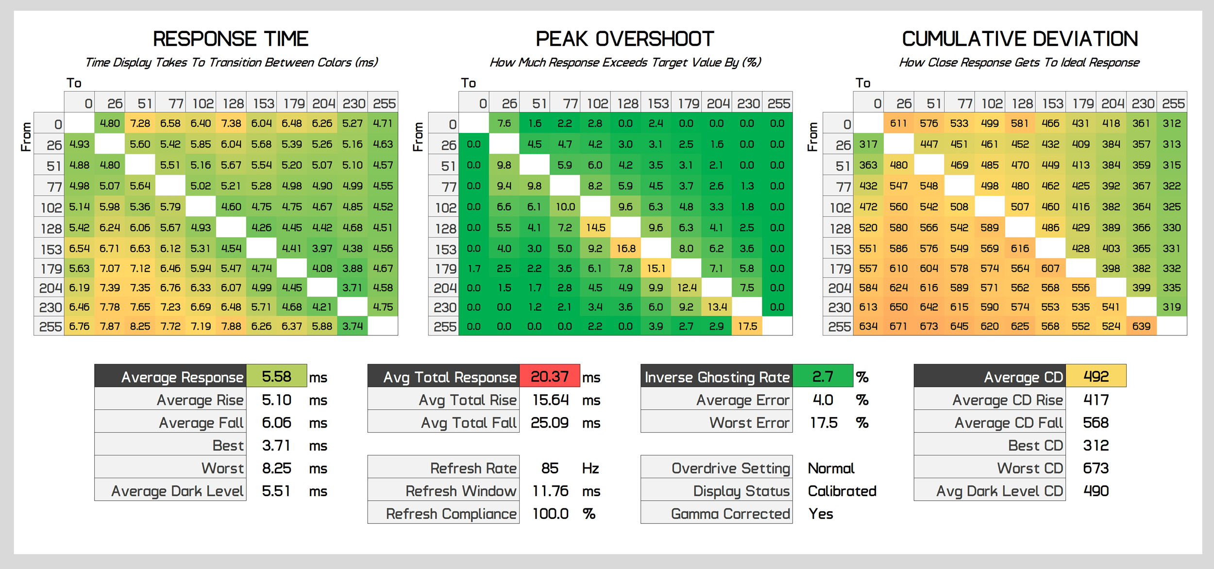 The other option is using the Normal mode. Response times are dialed back, instead of 4ms you typically see 5.5 to 6.0ms using the Normal mode, but the benefit is very low overshoot. Even as we go all the way down to 60Hz, overshoot is basically a non issue, and in fact cumulative deviation remains really solid, showing us that nice balance between response and overshoot.