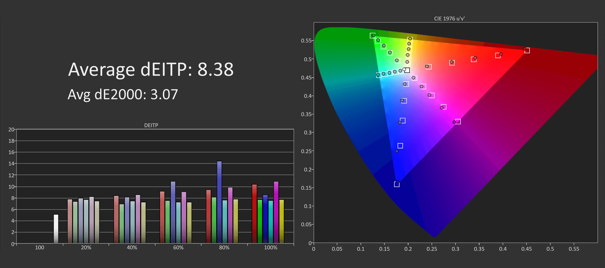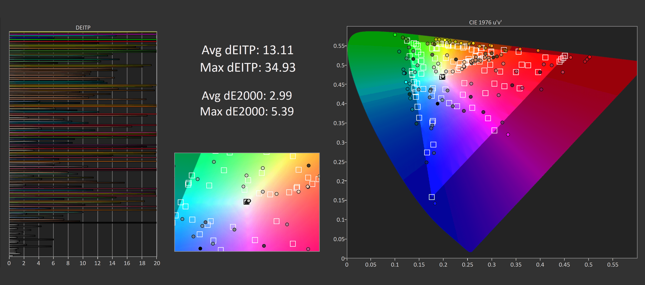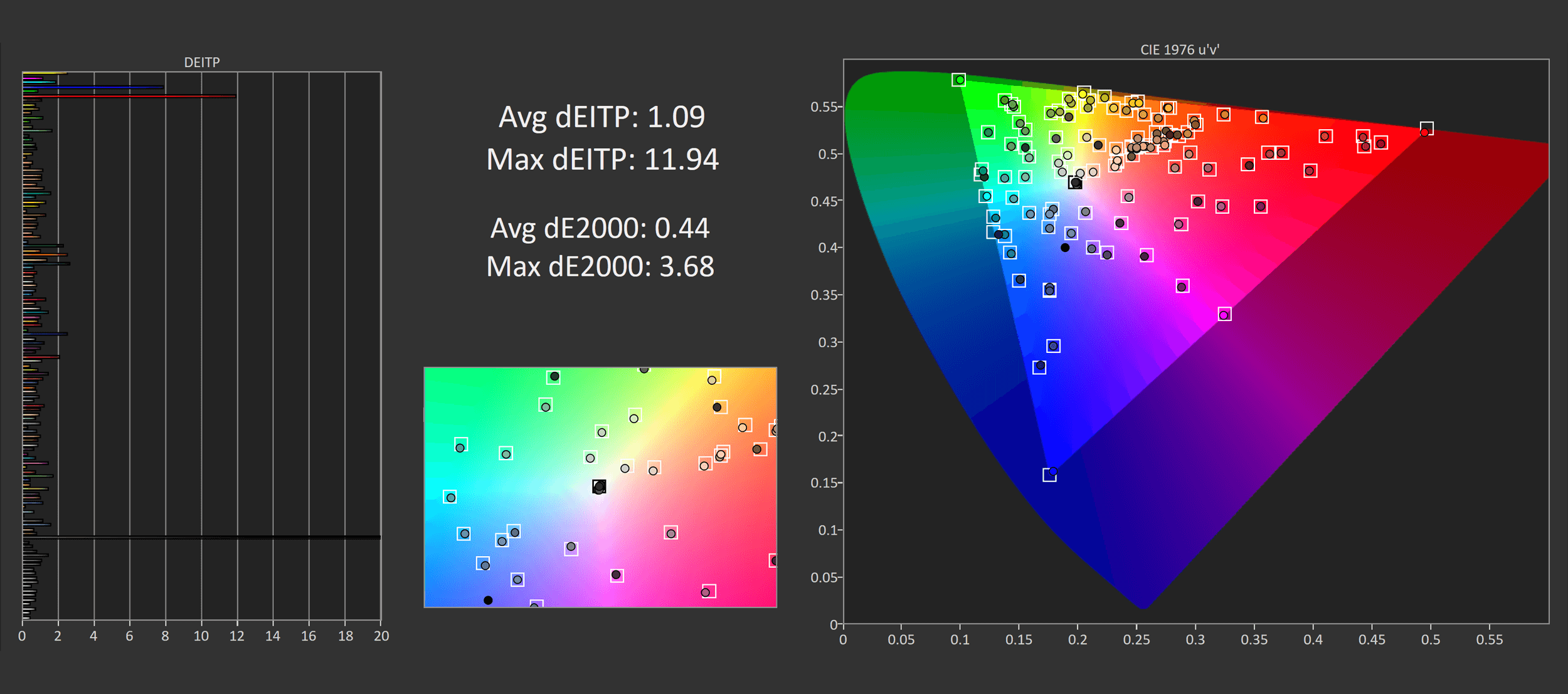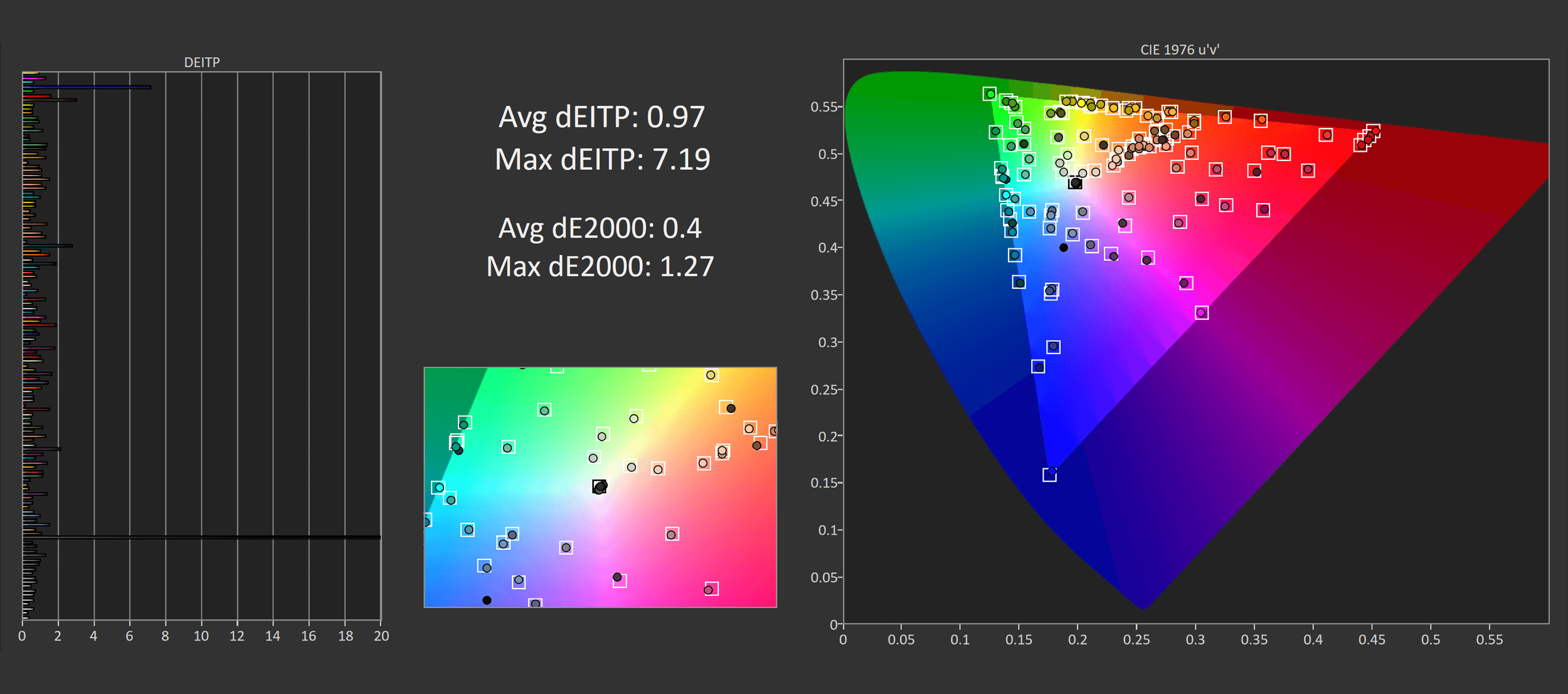 This monitor has impressive factory calibration for greyscale. LG has made a noticeable effort to ship the monitor with a 6500K white point and sRGB gamma out of the box, which leads to excellent deltaE numbers. Default SDR performance is only let down by an unclamped color gamut rather than a restriction to sRGB, which leads to some oversaturation. With that said this is one of the more accurate oversaturated results, if that's a thing.