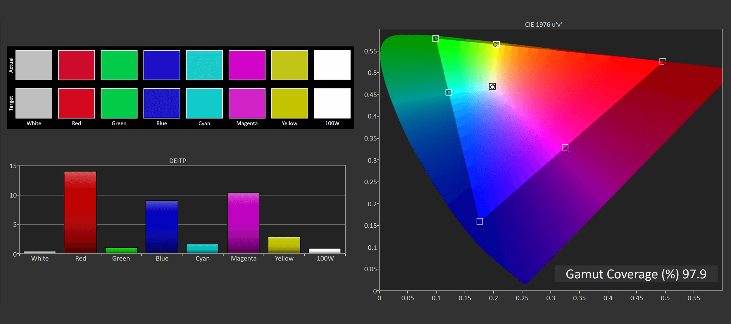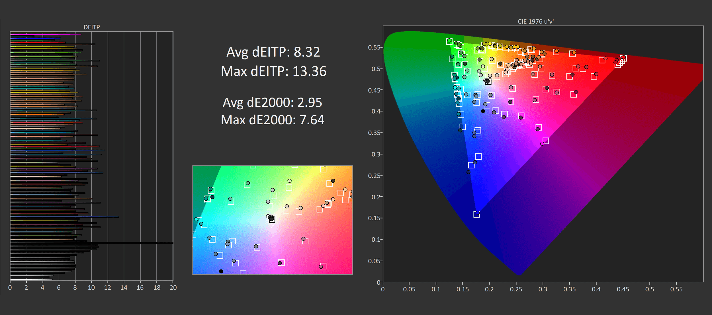 For color performance the 32GQ950 has very similar wide gamut capabilities to other LG monitors using LG panels. We get 98% DCI-P3 coverage, which is dead on what LG claims and a great result for that color space and a lot of wide gamut content. However there's no meaningful extension into Adobe RGB, so it's not a great monitor if you need that color space. Overall we get 76% Rec. 2020 coverage which these days is a good but mid table result.