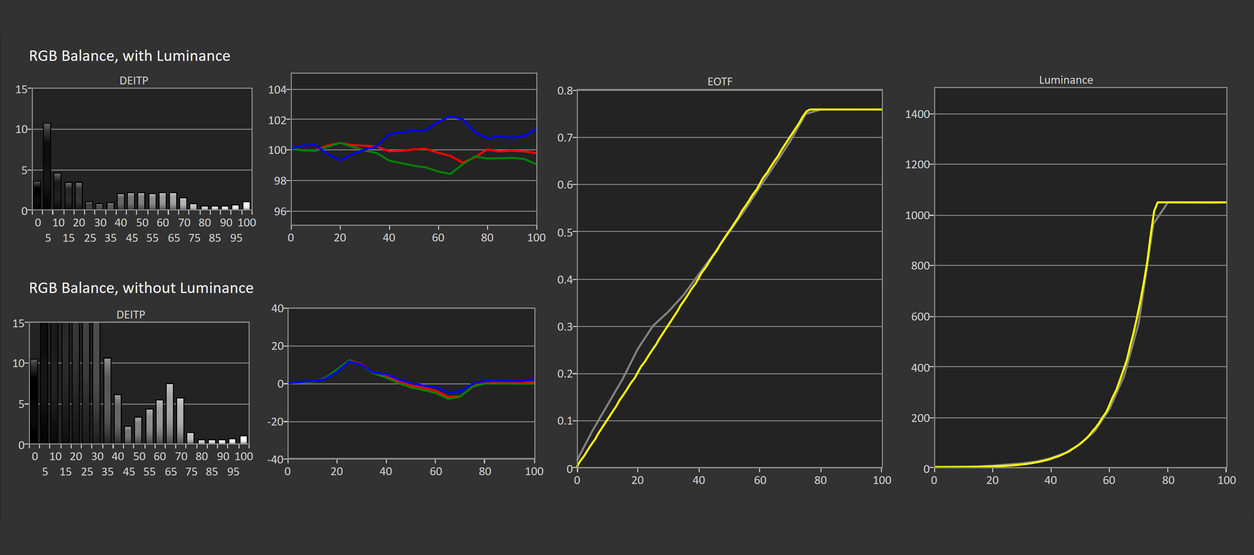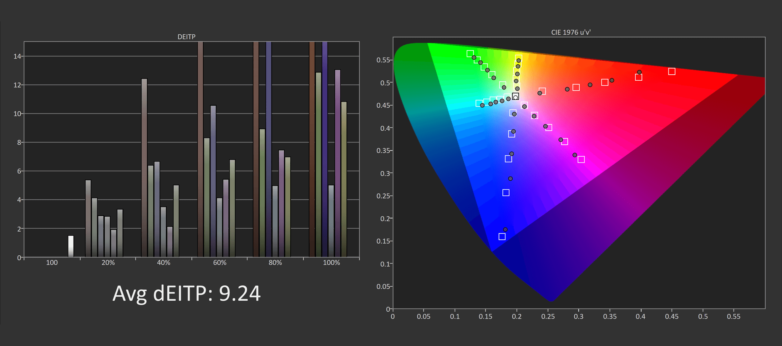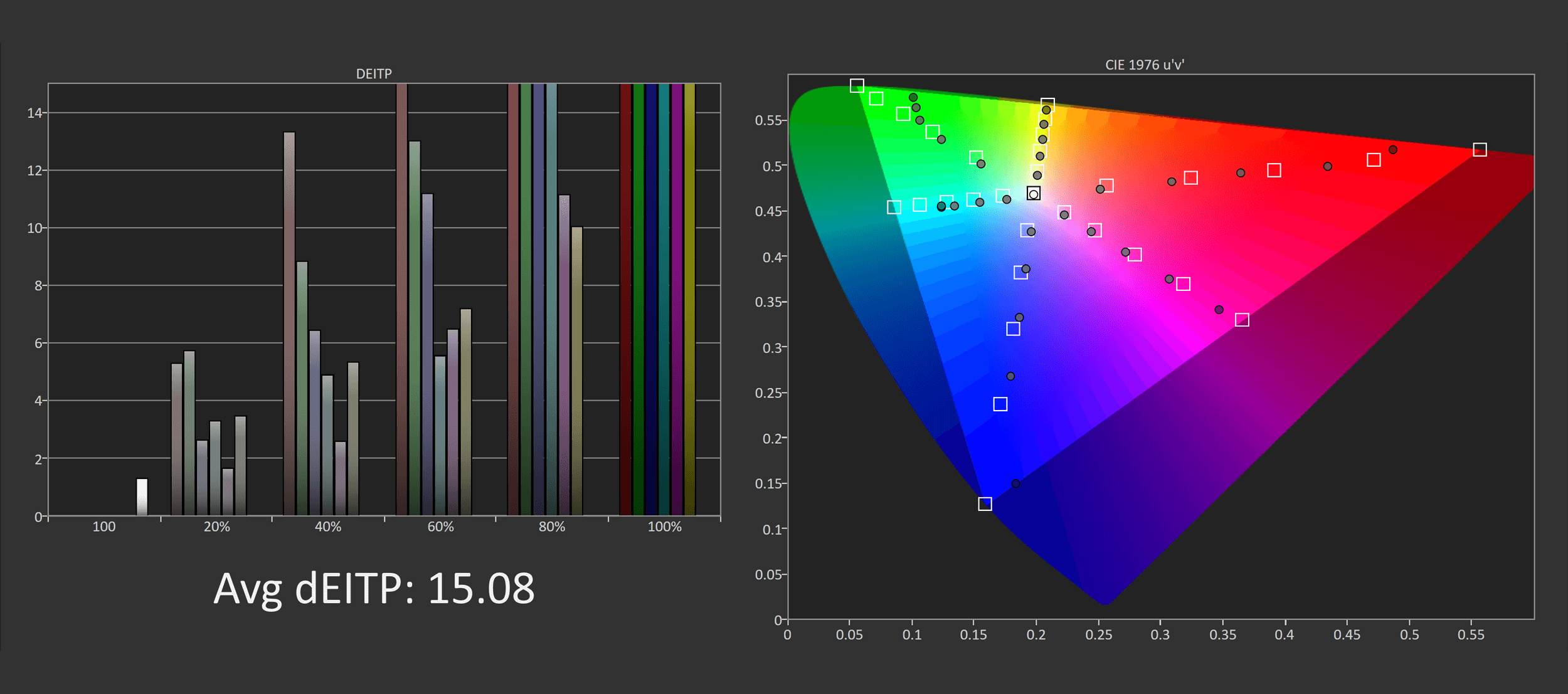 In terms of HDR accuracy, LG does an average job of EOTF tracking and rolloff at higher brightness levels. Color accuracy in the HDR mode is also decent but not amazing, accuracy isn't a huge concern, it's more that the contrast and dimming abilities are ineffective.