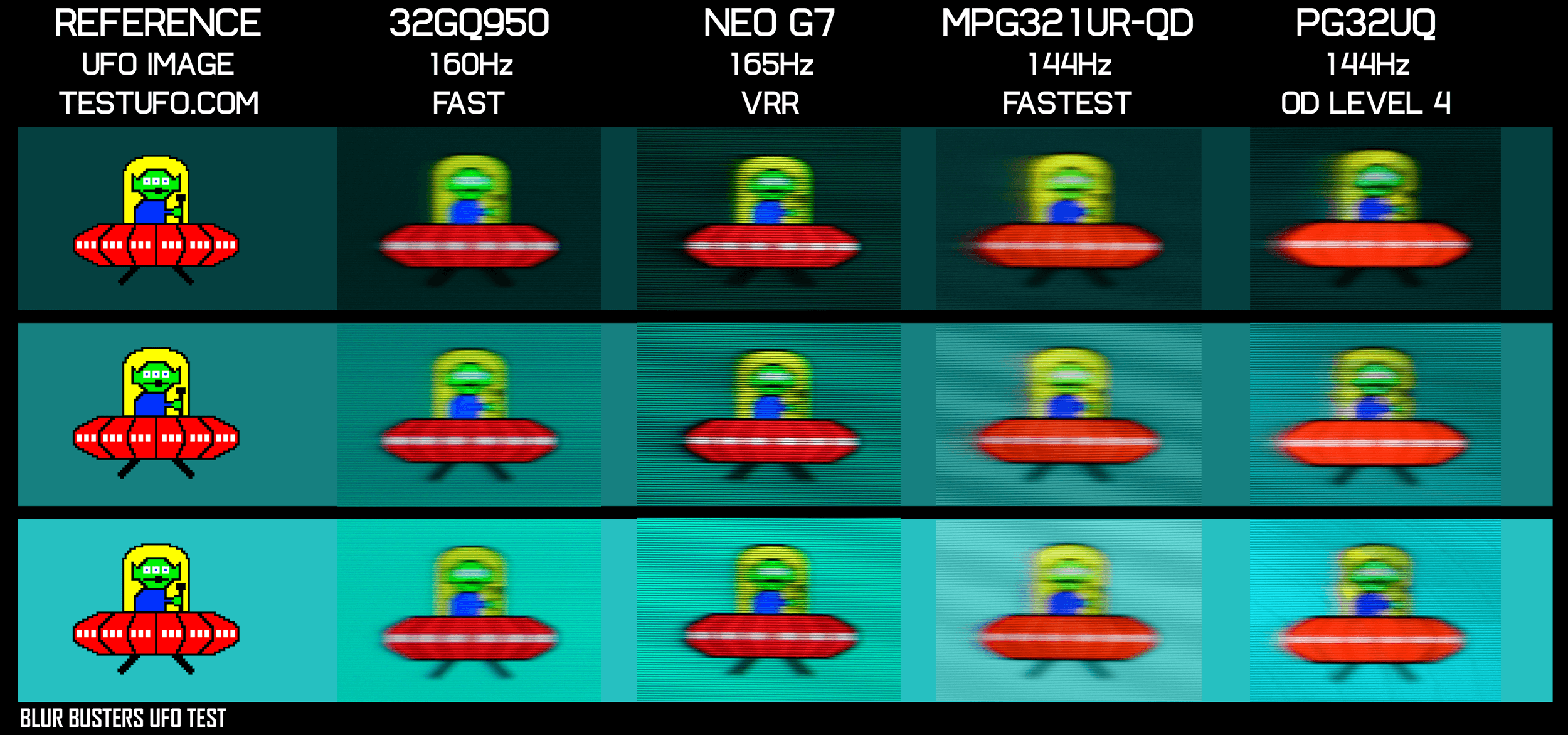 On average across the refresh range the 32GQ950 performs well. While it is a mid-table performer using the Normal setting, it has exceptionally low overshoot. It's roughly 50% faster than older 32-inch 4K monitors like the Asus PG32UQ and MSI MPG321UR-QD, while also delivering less overshoot, so that's an excellent result. All of the monitors that beat it in response times have higher overshoot, except OLEDs, of course, and if we had used the Fast mode instead of Normal mode it would have come close to matching the Neo G7.