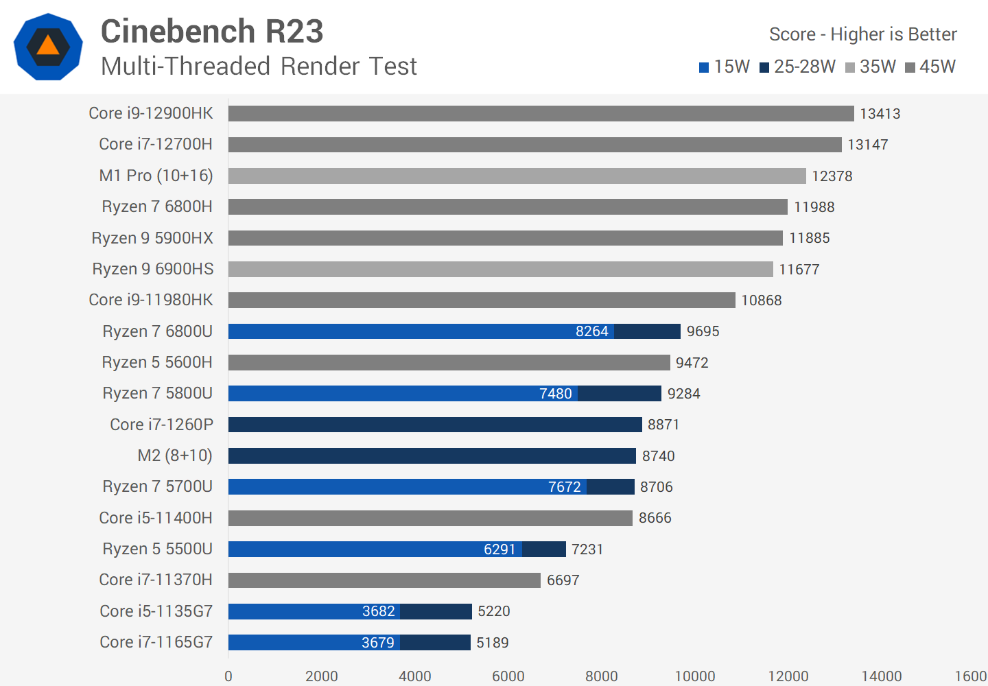In Cinebench R23 multithreaded we recorded 23 watts of power draw from the wall after subtracting the idle power usage of the system. This puts the general CPU package power between the two configurations of the Ryzen 7 6800U that we've tested, at 15W and 25W. What this suggests to us is the M2 is most equivalent to a 20W configuration when the CPU is heavily utilized, which is a typical number for an ultraportable 13-inch notebook.