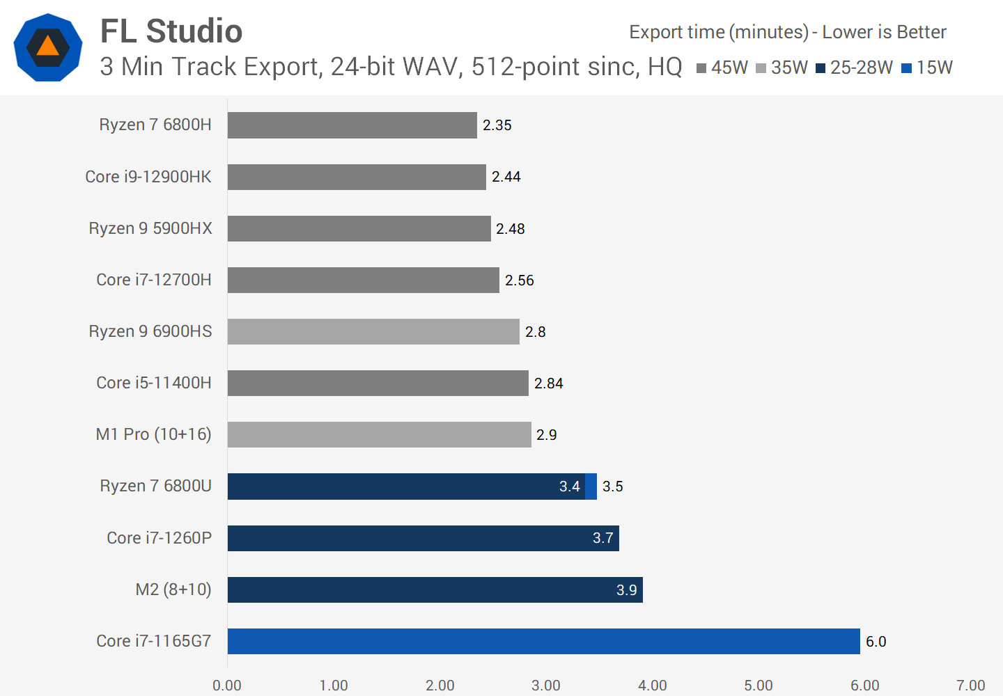 In FL Studio it's relatively close between the M2 and other mobile processors, although the M2 is the slowest part of the latest-gen CPUs that we've tested. The Ryzen 7 6800U is 16 percent faster in this workload when configured at 25W, and 12 percent faster at 15W, while the 1260P is 6 percent ahead.